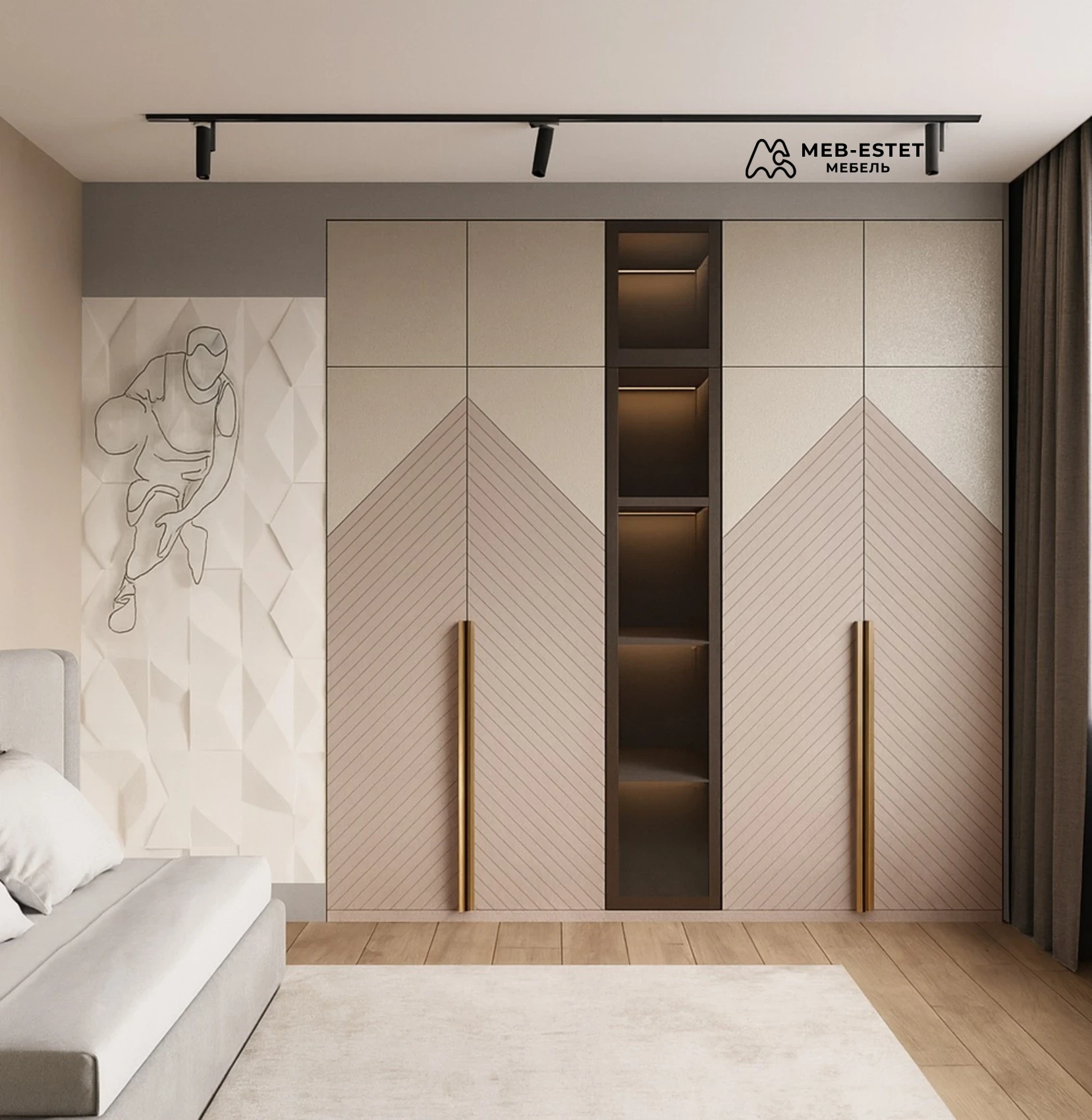 Индивидуальный встроенный распашной шкаф премиум-класса для спальни. Корпус и фасады из МДФ с шпоновой отделкой и фрезерованным узором создают аккуратную диагональную текстуру. Центр — открытые ниши с интегрированной тёплой подсветкой для декоративных предметов.