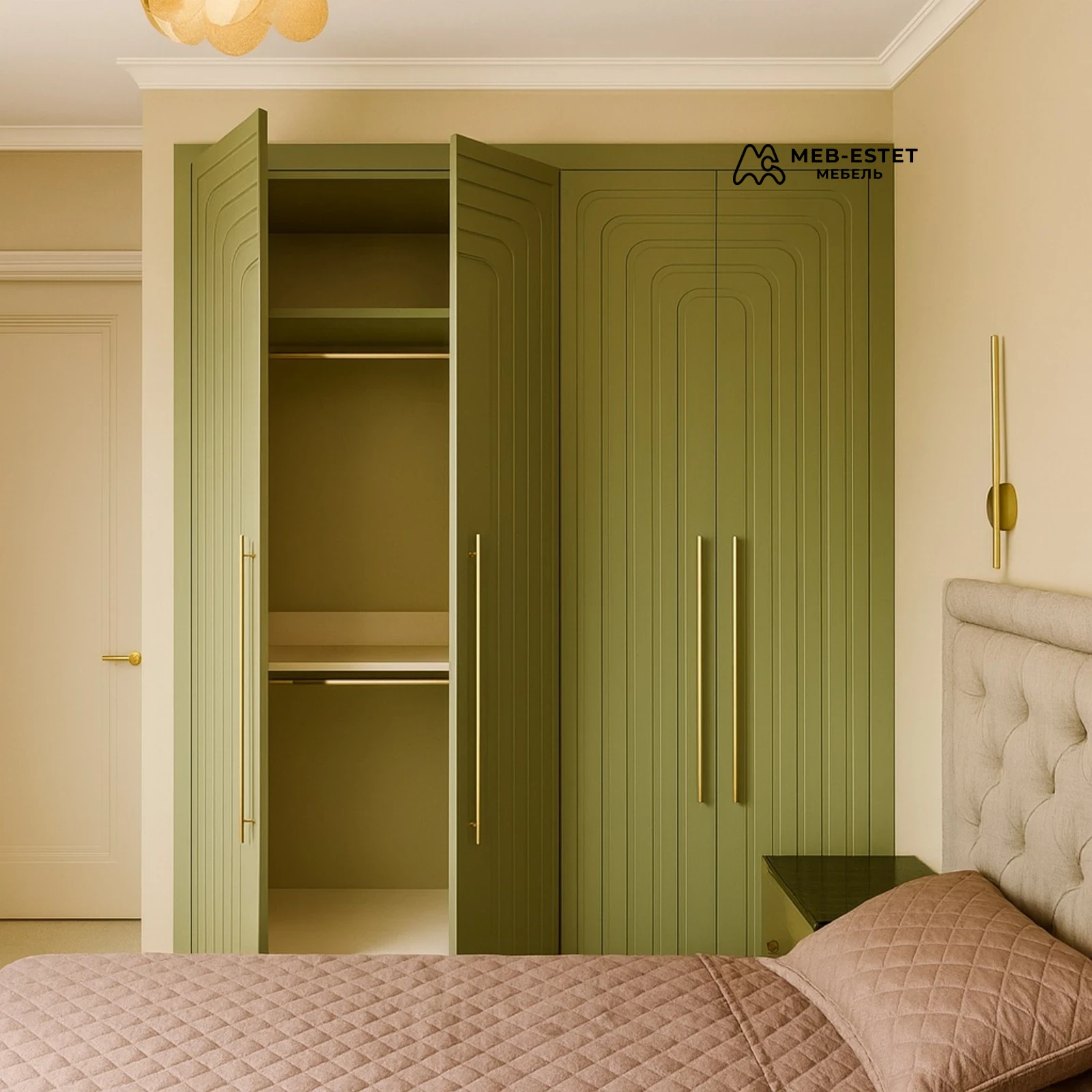 Стильный встроенный распашной шкаф премиум‑класса. Фасады выполнены из МДФ с фрезеровкой и матовой эмалью оливкового тона, длинные латунные ручки подчеркивают вертикальную архитектуру.