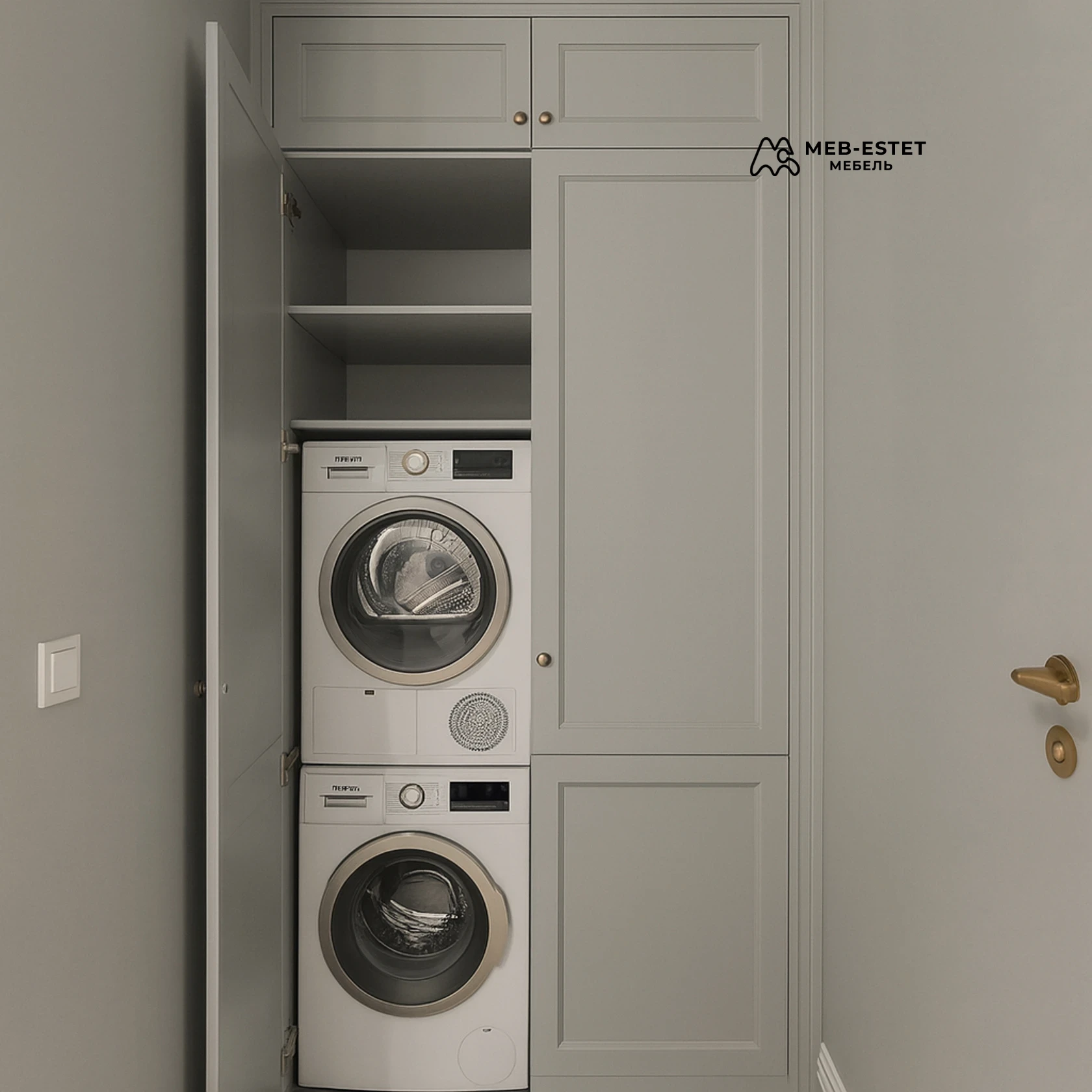 Элегантный встроенный шкаф для постирочной, разработан под стэк стиральной машины и сушилки. Выполнен из окрашенного МДФ с филёнчатыми фасадами и аккуратными латунными ручками. Конструкция продумана для вентиляции техники и удобного доступа.