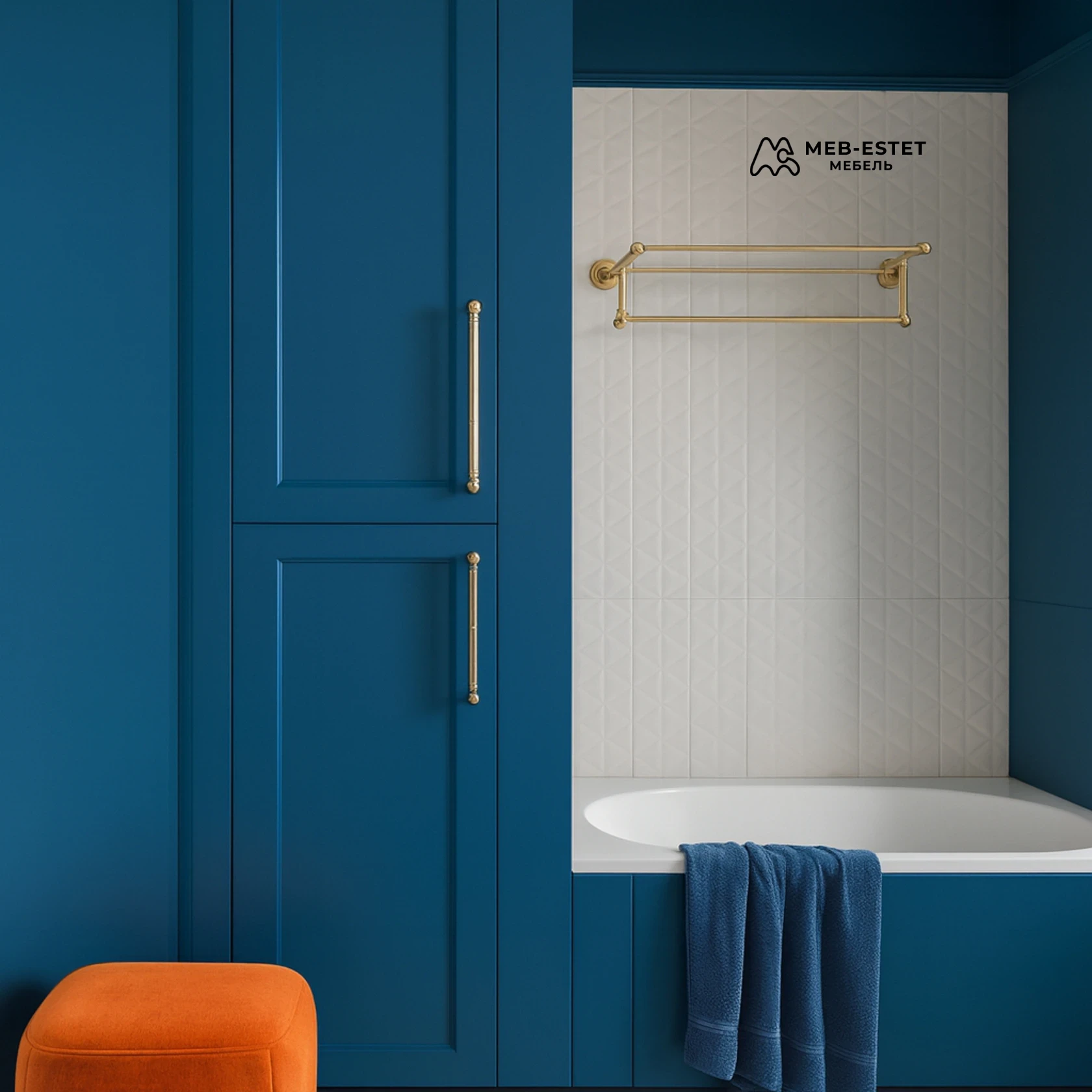 Элегантный встроенный шкаф рядом с ванной — сочетание классического фасада и современного влагостойкого решения. Изготовлен на заказ из крашеного МДФ с матовой эмалью и латунными ручками, идеально интегрируется в нишу вокруг ванны.