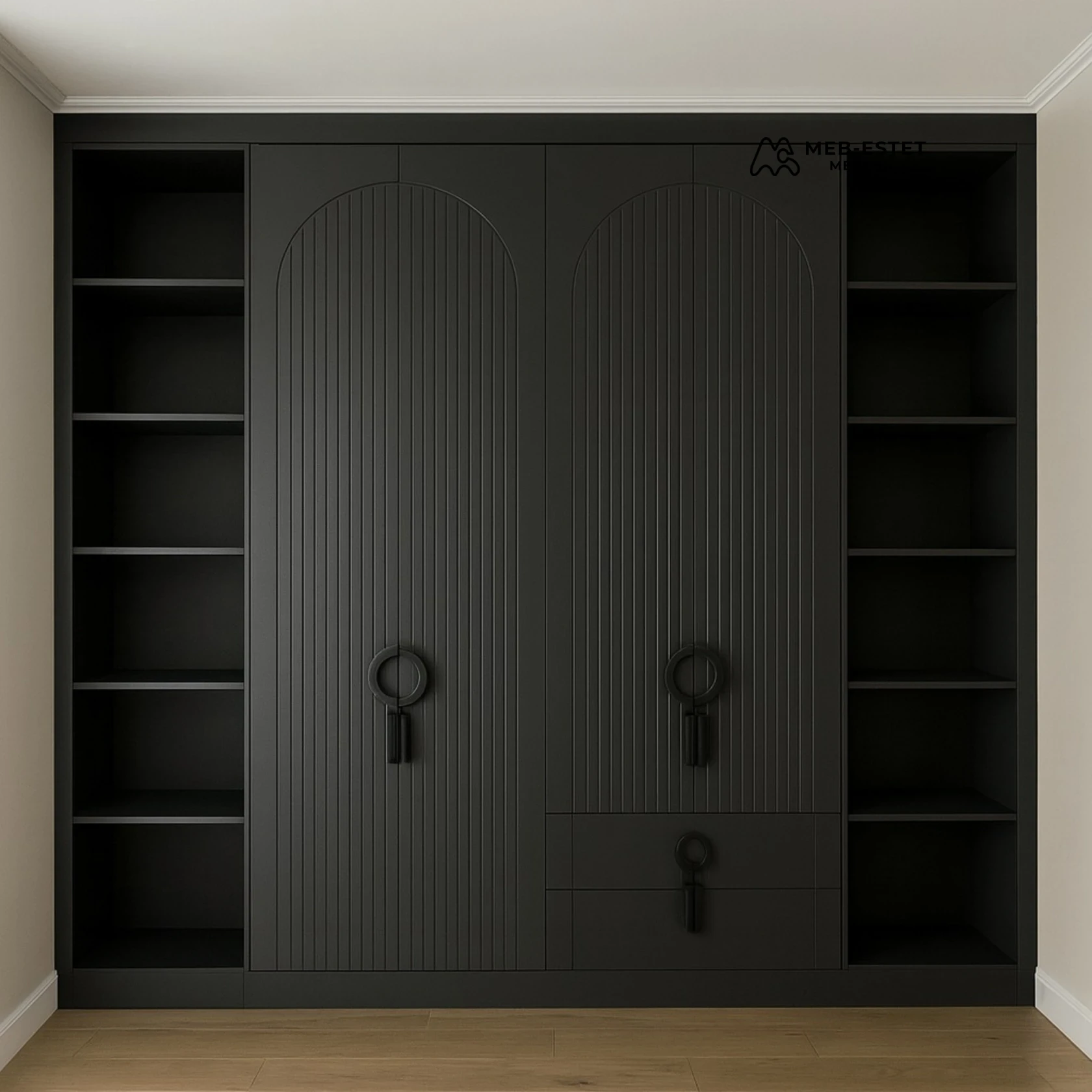 Элегантный встроенный шкаф-гардероб с фрезерованными арочными фасадами в матовом черном цвете. Корпус — ЛДСП, фасады — окрашенный МДФ с мелкой вертикальной фрезеровкой. Внутреннее наполнение — регулируемые полки, выкатные ящики на тихих направляющих, штанга для одежды. Кольцевые металлические ручки — как декоративный акцент и удобство захвата.