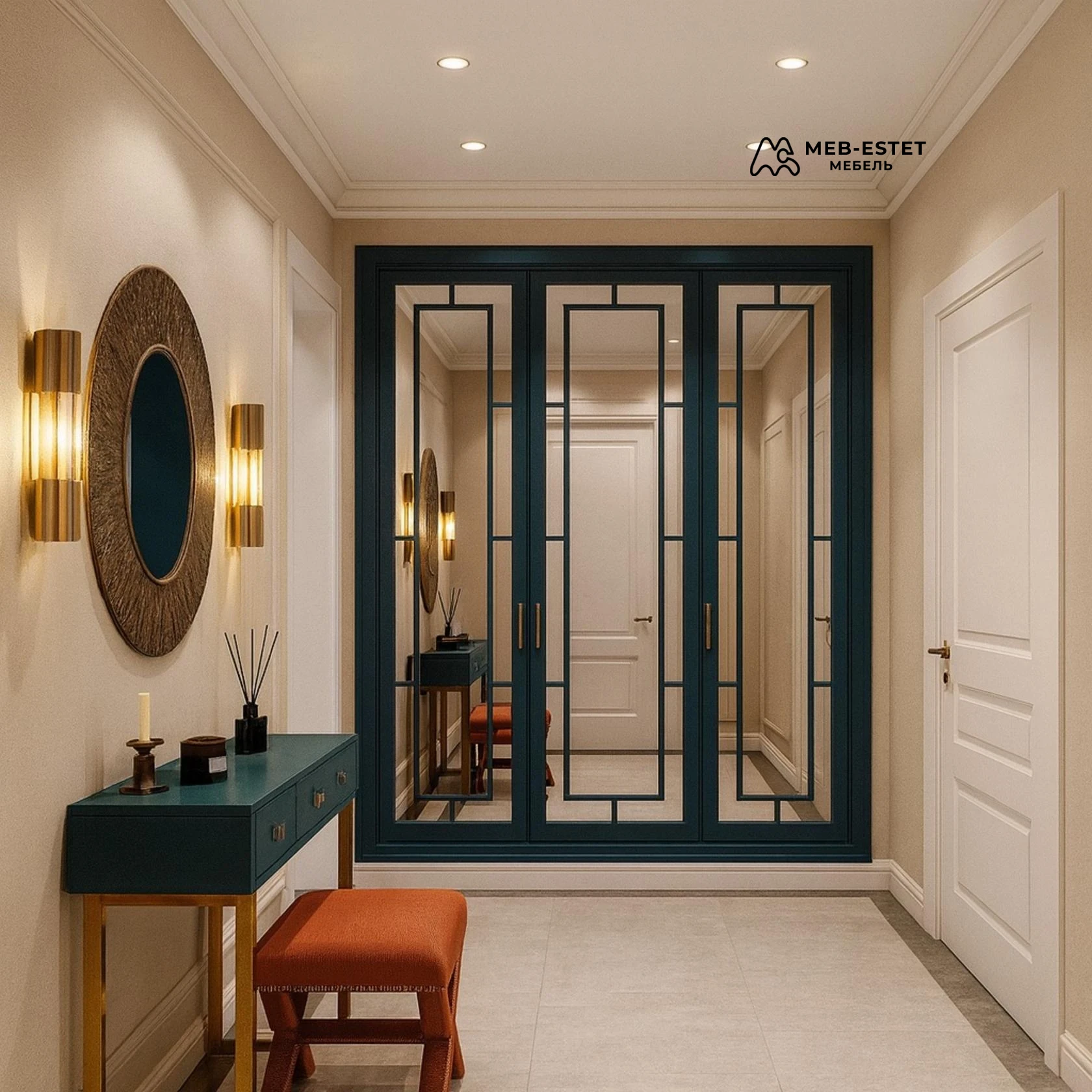 Элегантный встроенный шкаф для прихожей с крупными зеркальными распашными фасадами и декоративной геометрической раскладкой в тёмном оттенке. Решение ориентировано на премиум‑интерьеры — аккуратные пропорции и качественные материалы.