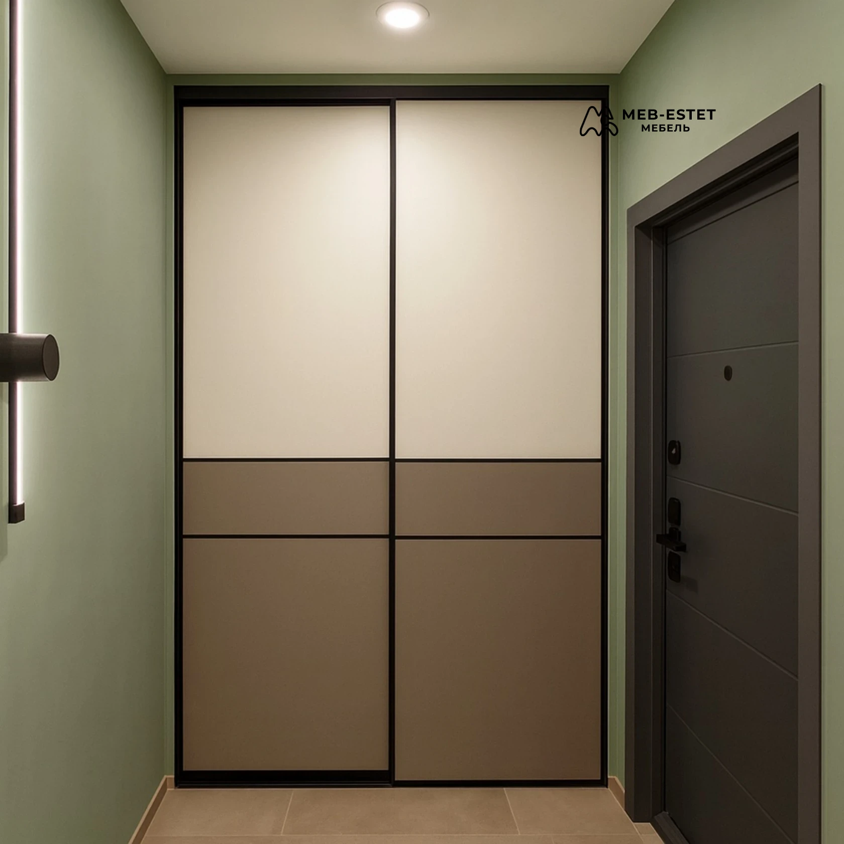 Двухдверный встроенный шкаф-купе для прихожей: лаконичный минимализм и продуманная функциональность. Корпус и фасады в матовой ЛДСП с контрастным алюминиевым профилем обеспечивают износостойкость и аккуратный внешний вид.