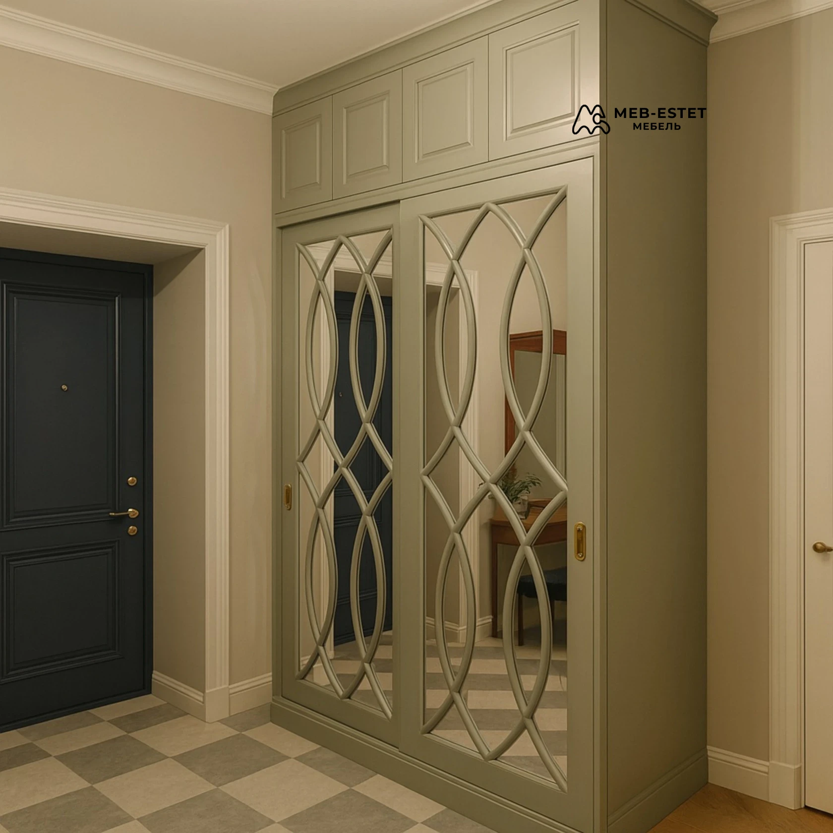 Встроенный шкаф-купе классического характера с зеркальными раздвижными дверями и декоративной раскладкой. Корпус и фасады — крашеный МДФ с фрезеровкой и карнизом, верхние антресоли интегрированы до потолка.