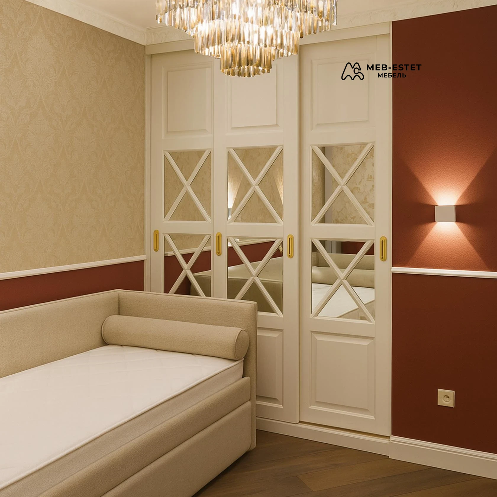 Встроенный шкаф-купе в неоклассическом ключе: окрашенные МДФ фасады с зеркальными вставками и декоративной «X»-раскладкой, врезные золотистые ручки. Решение увеличивает глубину комнаты и обеспечивает аккуратный визуальный акцент.