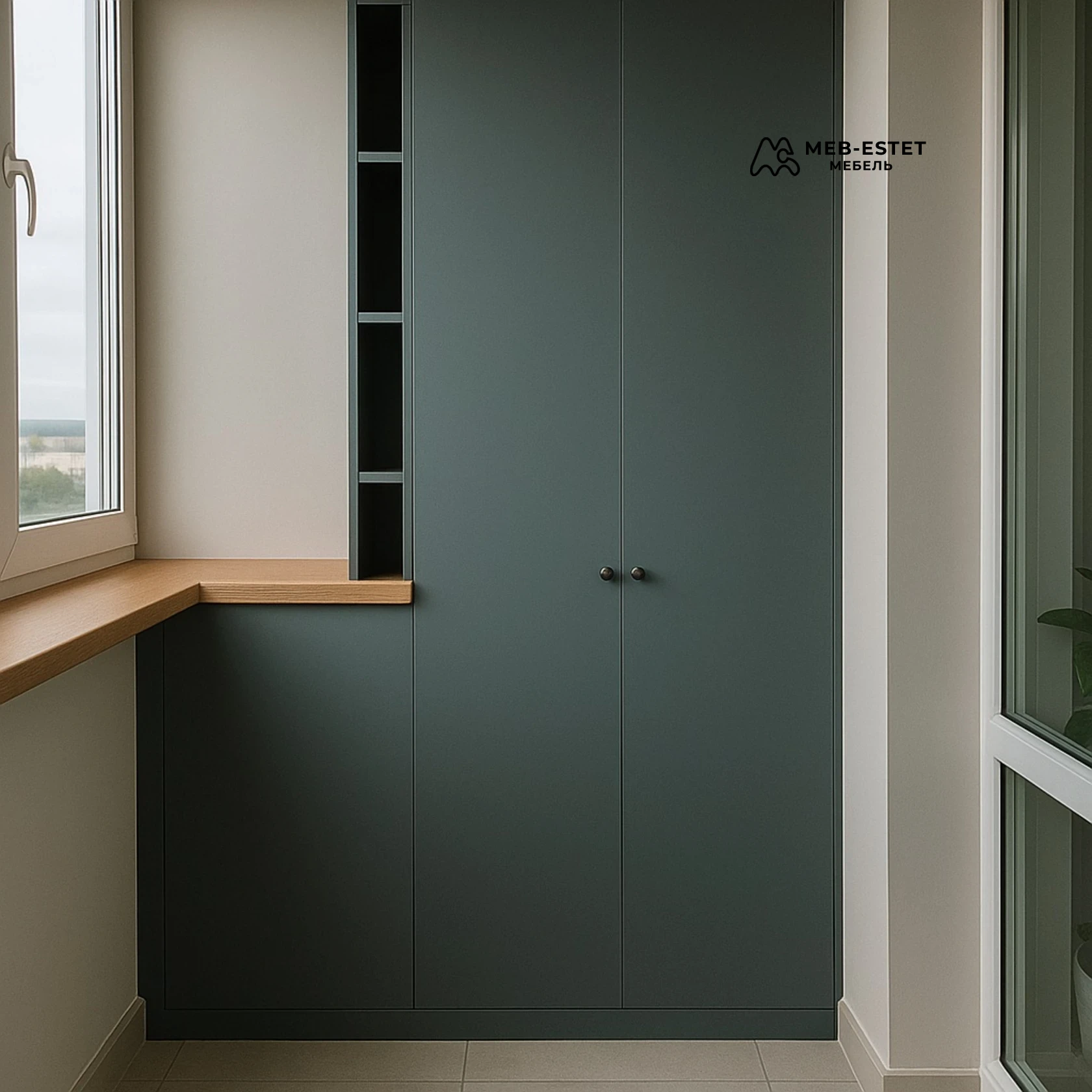 Компактный встроенный шкаф-пенал для балкона, выполнен на заказ с акцентом на премиальное исполнение и долговечность. Каркас из ЛДСП 18 мм, фасады — окрашенный МДФ в матовой эмали, скрытые петли с мягким закрыванием и металлические ручки.