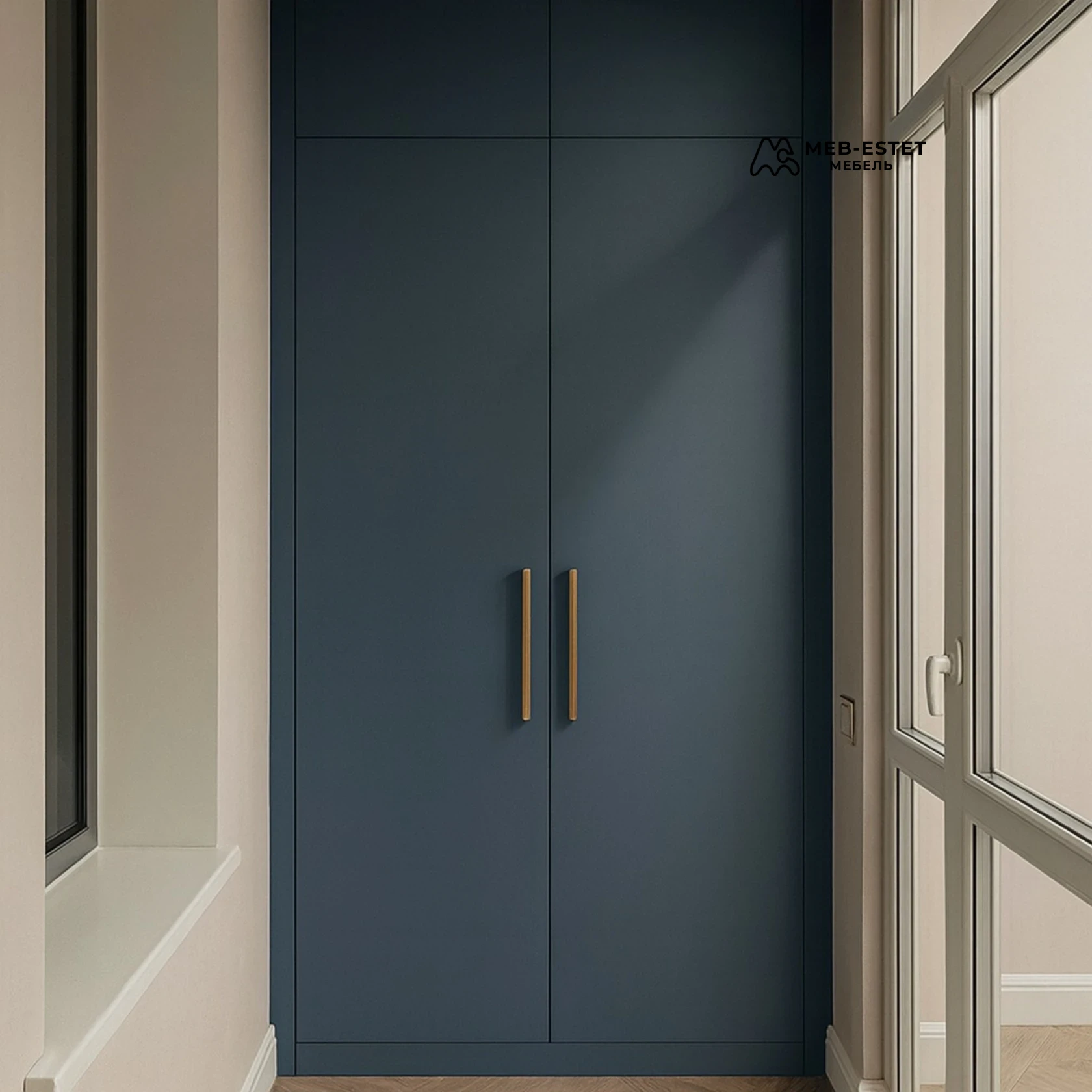 Встроенный высокий шкаф с матовым синим фасадом — решение для компактного балкона и прихожей. Корпус выполнен из ЛДСП 16–18 мм, фасады — окрашенный МДФ в эмали матовой фактуры. Двери распашные с узкими зазорами, вертикальные латунные ручки, петли с доводчиками и телескопические направляющие обеспечивают плавную и тихую эксплуатацию.