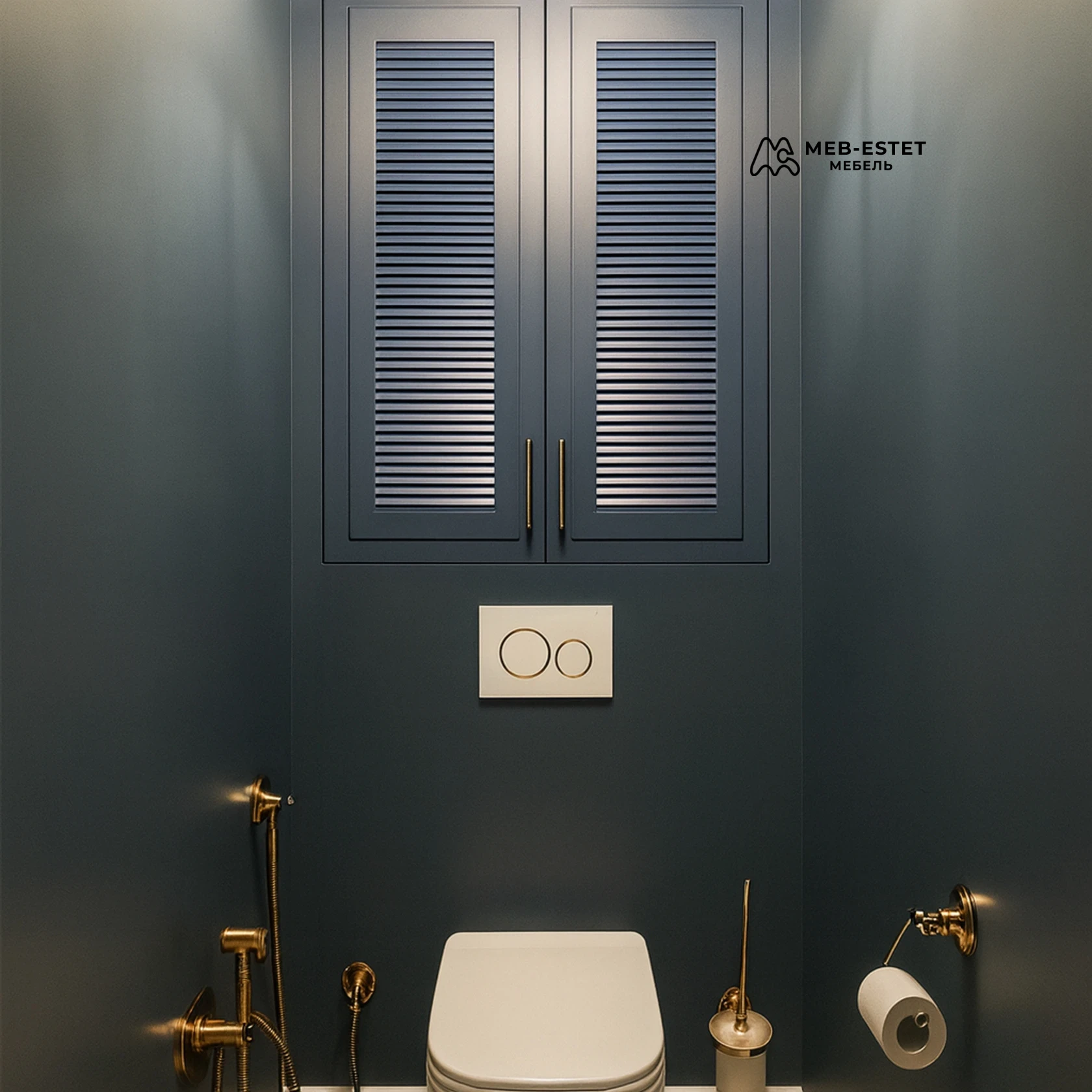Компактный встроенный шкаф с жалюзийными дверцами, выполнен по индивидуальному заказу для санузла. Решение объединяет аккуратный внешний вид и функциональность — оптимально над инсталляцией унитаза.