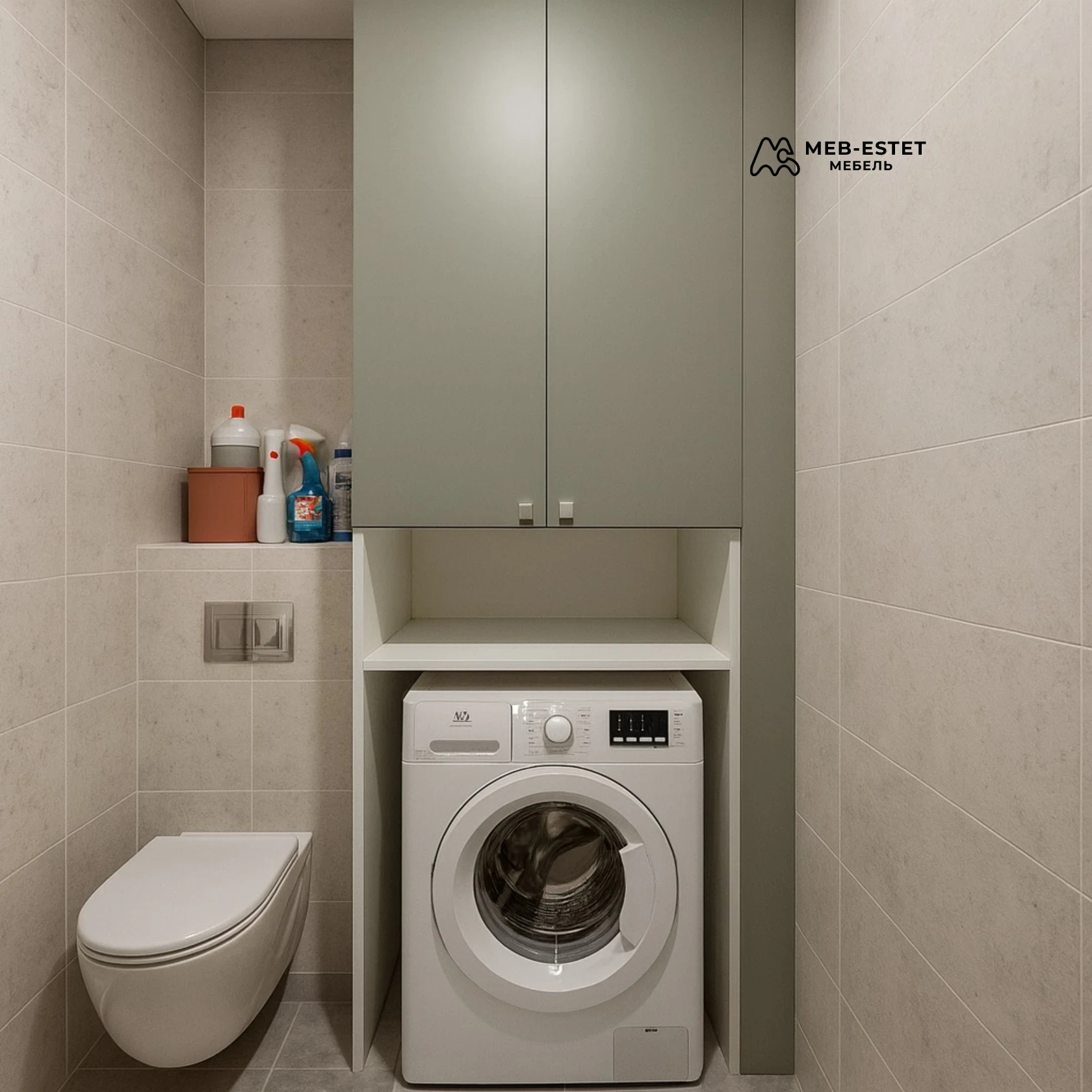 Компактный встроенный шкаф-пенал над стиральной машиной — решение для аккуратной ванной и постирочной. Каркас из ламинированного ЛДСП белого цвета, фасады — окрашенный МДФ с матовой поверхностью, маленькие металлические ручки. Внутри — полки для бытовой химии и белья, ниша для стиральной машины с вентиляцией. Конструкция продумана для надежного крепления к стене и удобного доступа к коммуникациям.