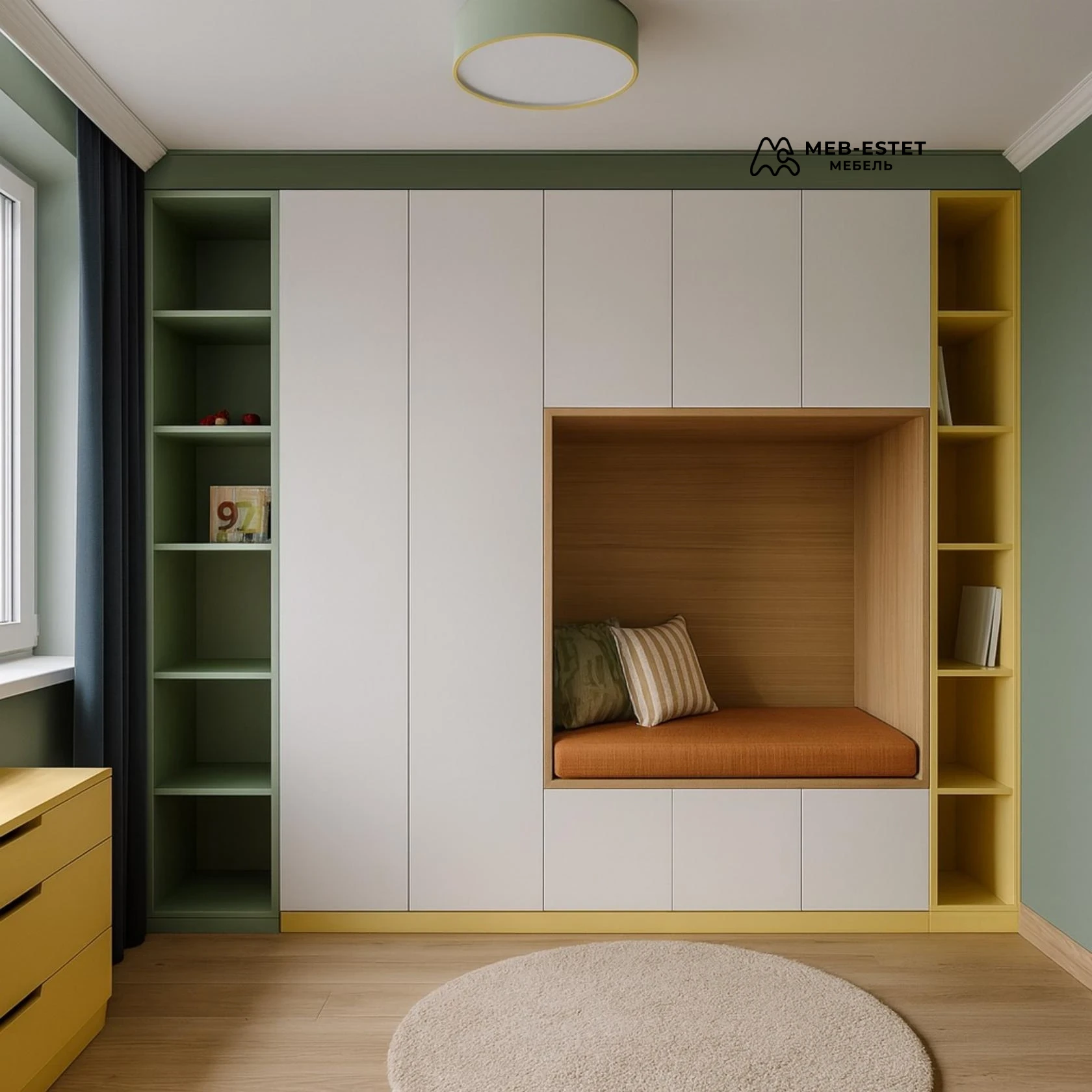 - Ниша с мягким сиденьем и выдвижными ящиками для хранения