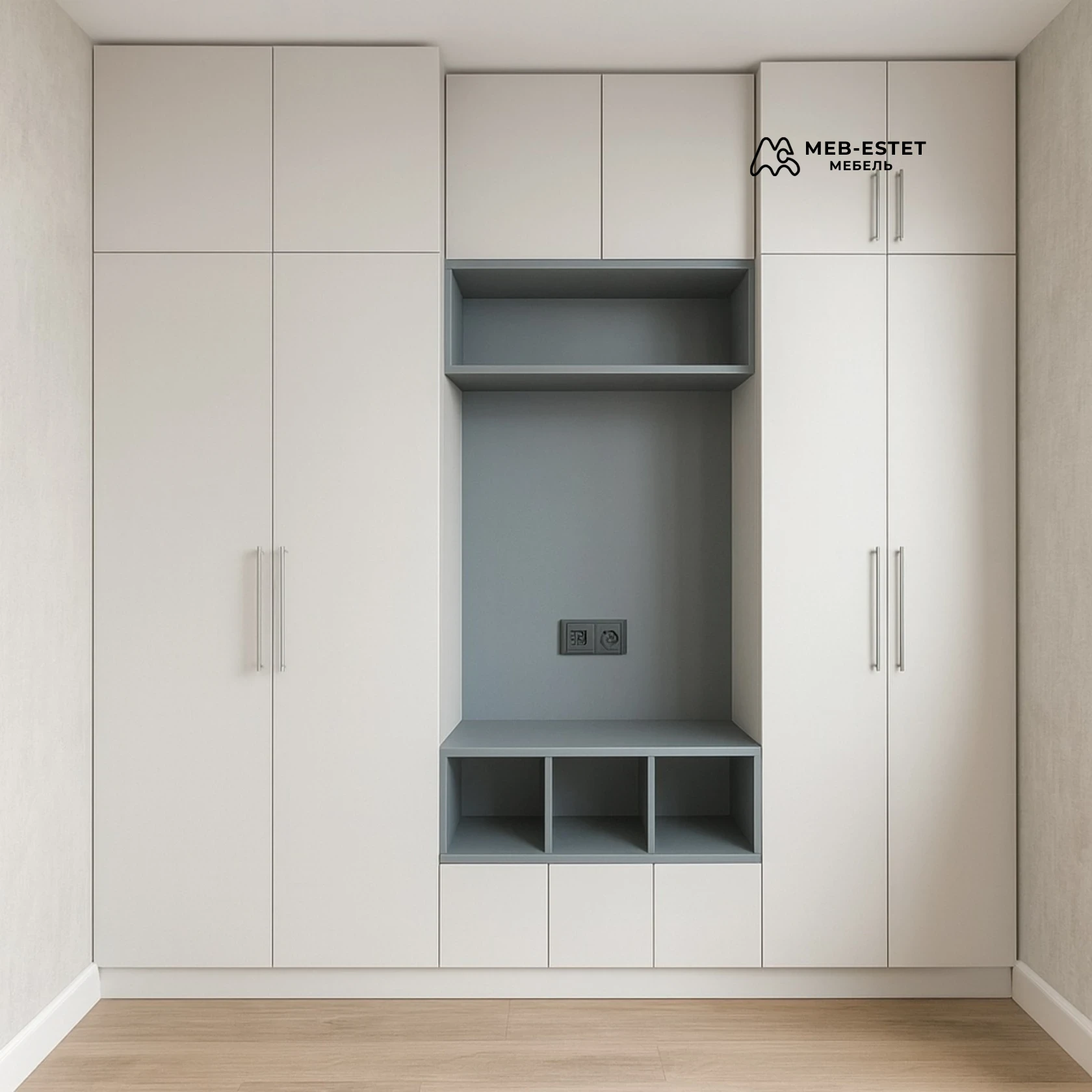Компактный встроенный шкаф премиум-класса с центральной нишей под ТВ или обувной банкет. Корпус из ЛДСП/МДФ, фасады — матовая поверхность. Мягкое доведение дверей, прочные петли и алюминиевые ручки гарантируют долговечность и аккуратную эксплуатацию.