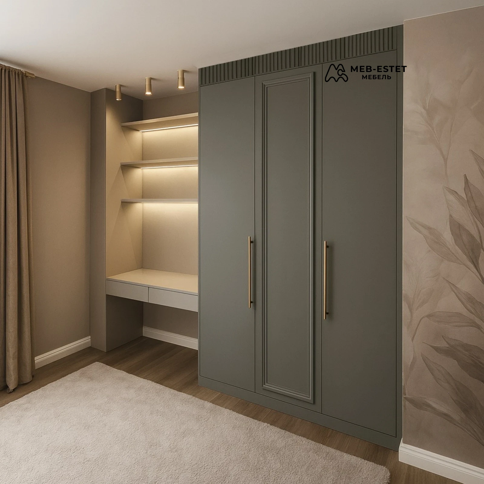 Встроенный распашной шкаф с рабочей нишей. Корпус и фасады изготовлены из МДФ с эмалевым покрытием, фрезерованная филенка и реечный фриз добавляют акцента. Ниша оборудована подсветкой и двумя выдвижными ящиками, служит рабочей зоной или гардеробной стойкой.