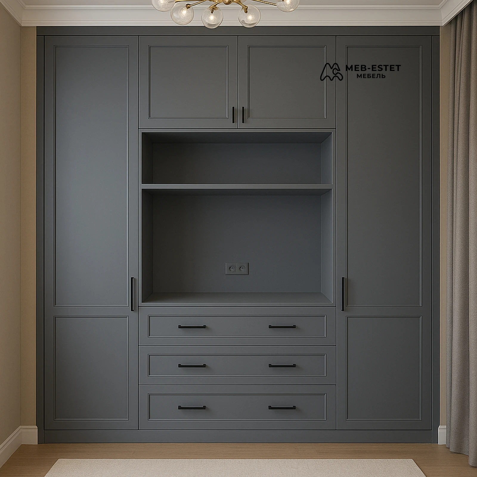 Конструкция предусматривает скрытые петли, телескопические направляющие с доводчиками, нишу с выводом кабелей, три вместительных ящика и продуманную систему полок. Возможна комплектация подсветкой и дополнительными аксессуарами для хранения.