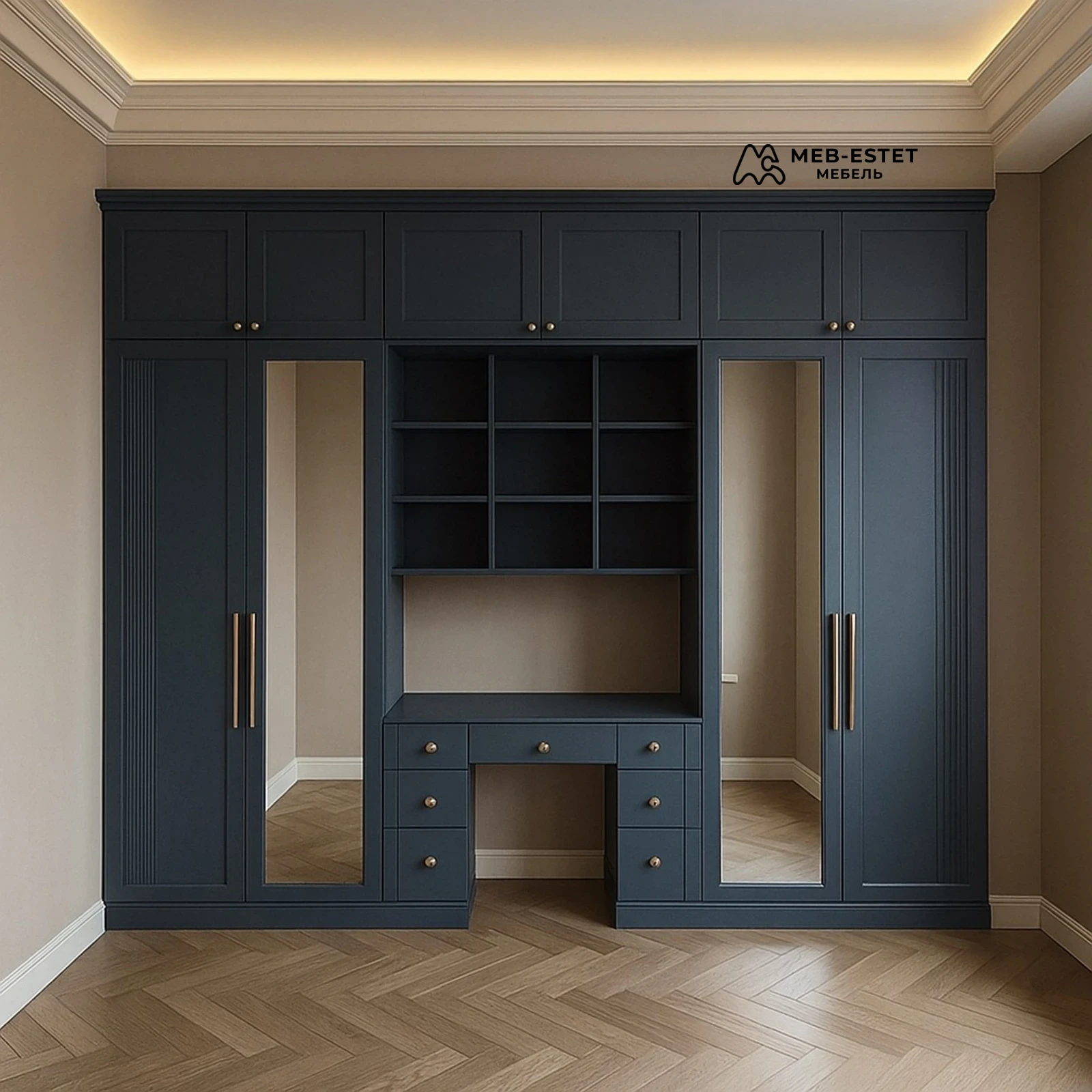 Встроенный шкаф с рабочей зоной и зеркальными дверцами, выполнен под заказ в неоклассическом ключе. Корпус и фасады из МДФ с эмалевой матовой покраской, фрезерованная филёнка и верхний карниз придают глубину. Встроенные полки-стеллажи над рабочим местом, симметричные выдвижные ящики на направляющих с доводчиками и антресоли дают удобство хранения. Латунная фурнитура и длинные ручки подчёркивают премиум качество. Подходит для спальни или кабинета.