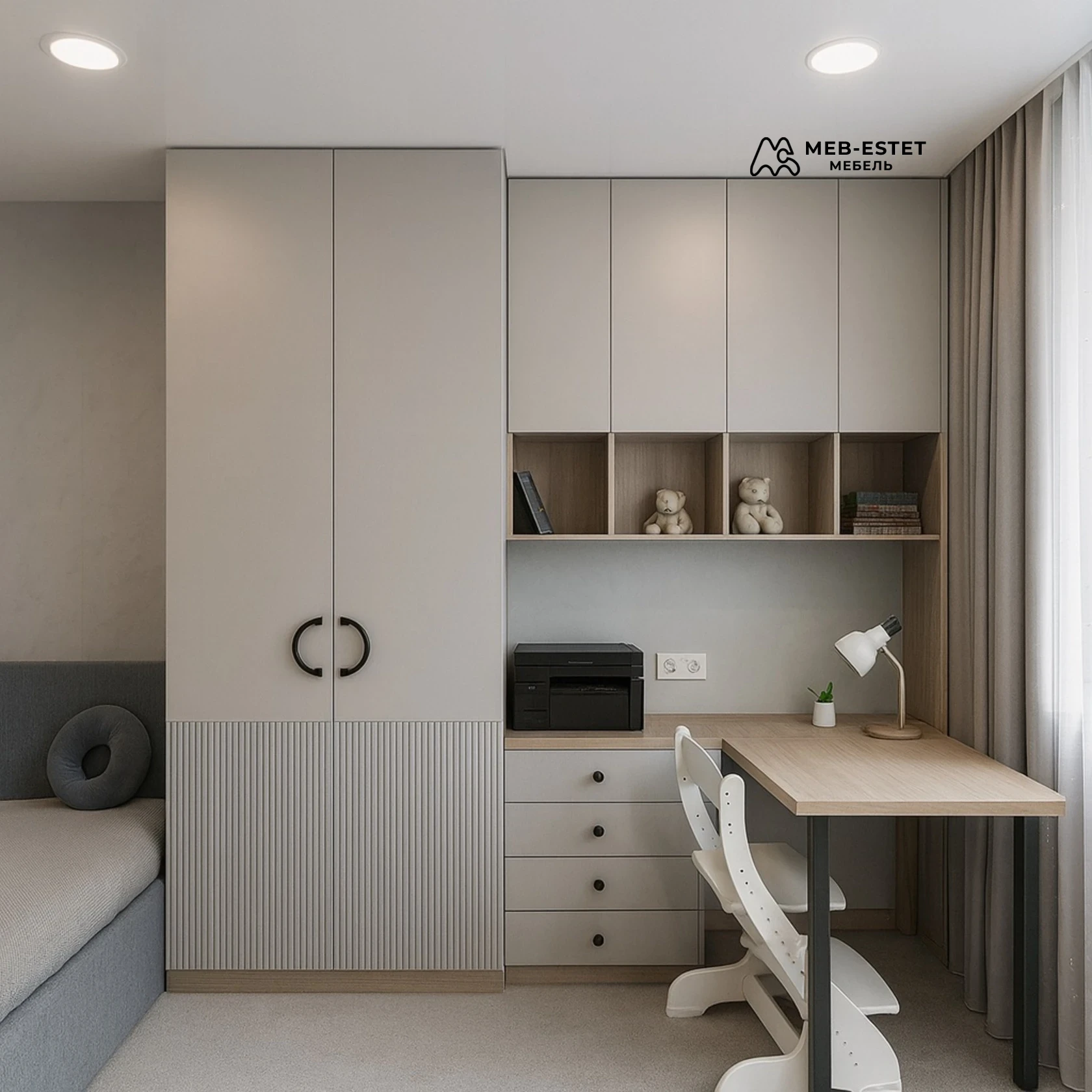 Компактная встроенная композиция — шкаф со шкафчиками над рабочей зоной и выдвижными ящиками. Выполнена в спокойной бежево-серой гамме: матовые фасады и деревянные открытые ниши для книг и декора.