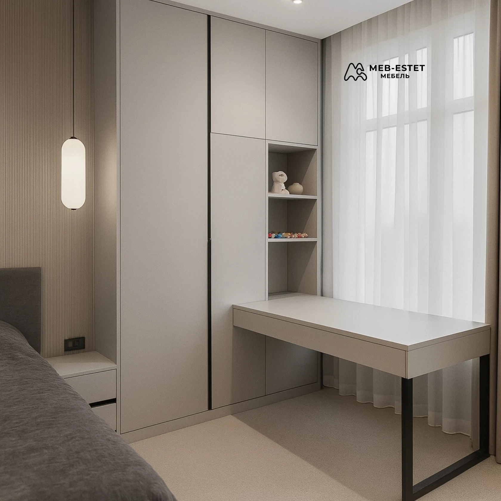 Компактная встроенная мебель для спальни с интегрированной рабочей поверхностью и открытыми нишами. Чёткие линии, безручечный фасад и матовая фактура создают спокойный минималистичный интерьер.