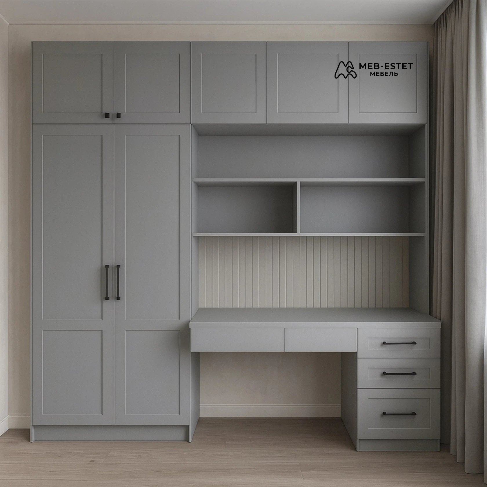 Встроенный шкаф с рабочей зоной премиального уровня в матовом сером цвете. Комбинирует платяной модуль, верхние антресоли, открытые полки и рабочий стол с тремя выдвижными ящиками — практичное и аккуратное решение для спальни или кабинета.