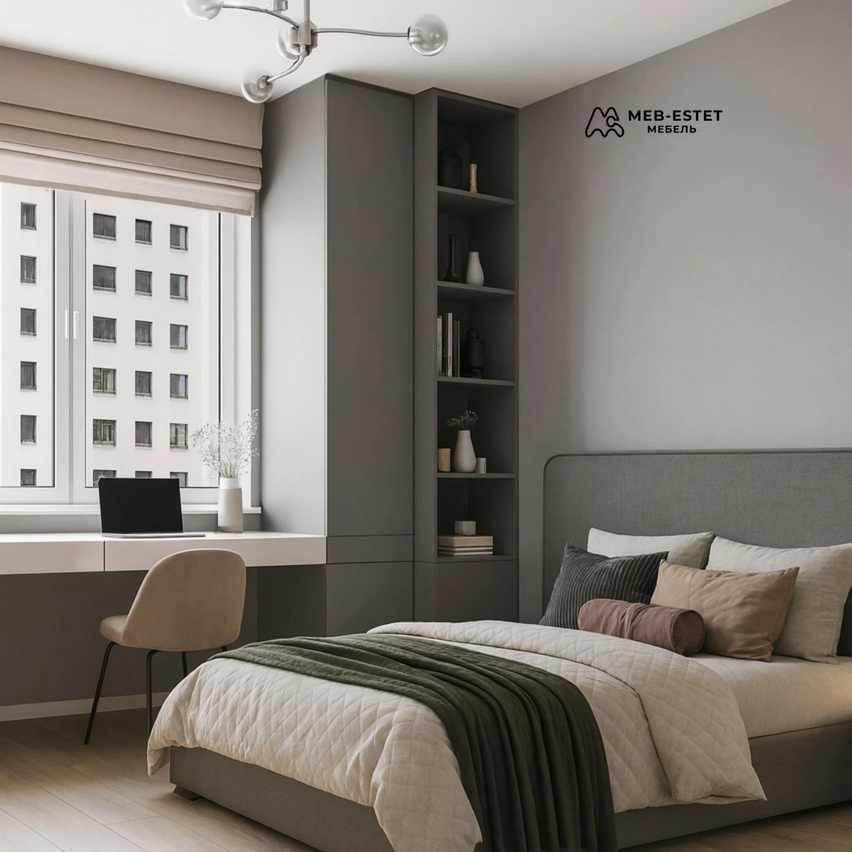 Премиальный встроенный модуль для спальни: высокий шкаф с распашной дверью, открытый стеллаж и рабочая зона под окном. Выполняется по индивидуальным размерам с акцентом на аккуратные скрытые стыки и качественную фурнитуру.