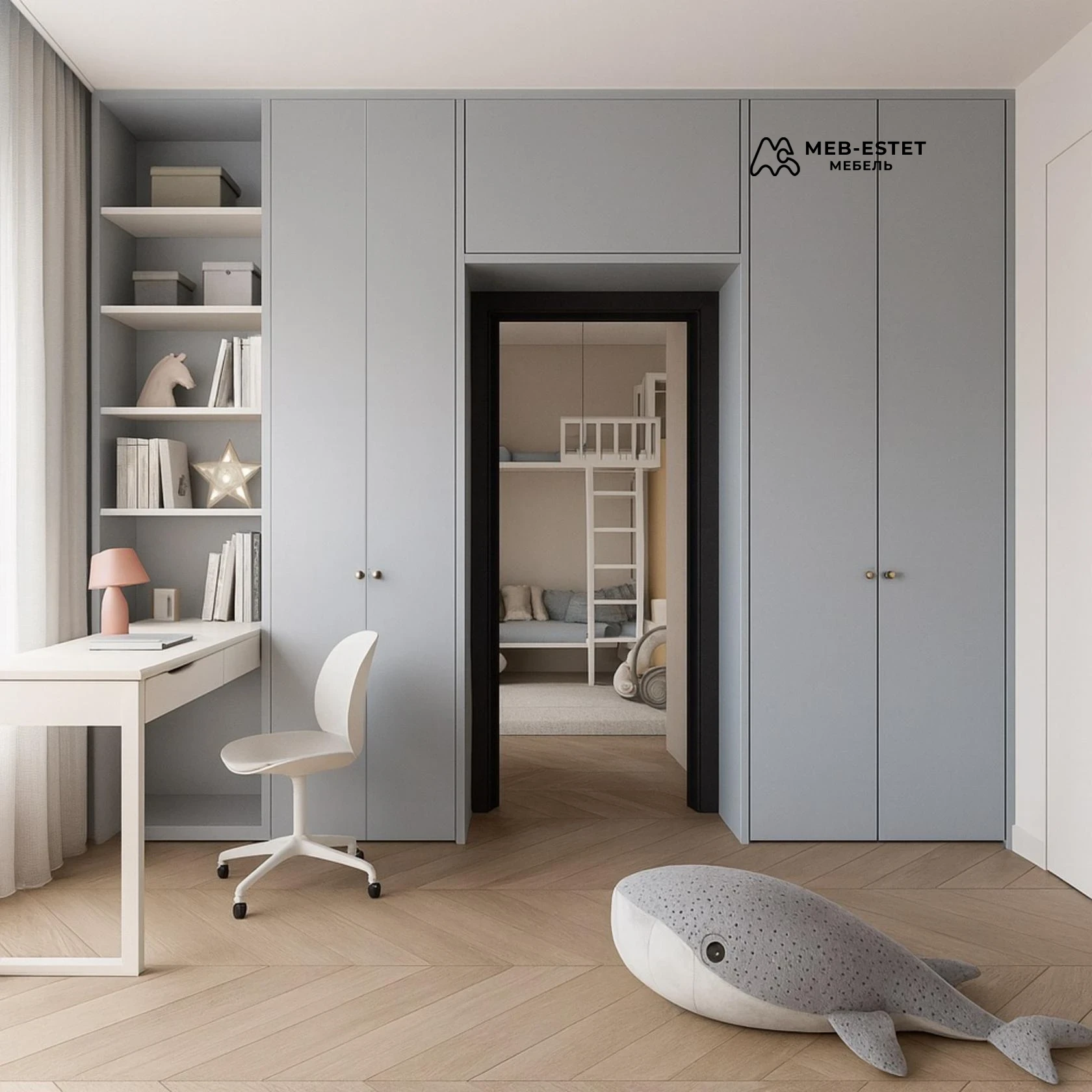 Встроенный шкаф вокруг дверного проёма — функциональное и визуально лёгкое решение для детской или спальни. Матовые фасады, аккуратные металлические ручки и единая цветовая гамма подчёркивают премиум-уровень.
