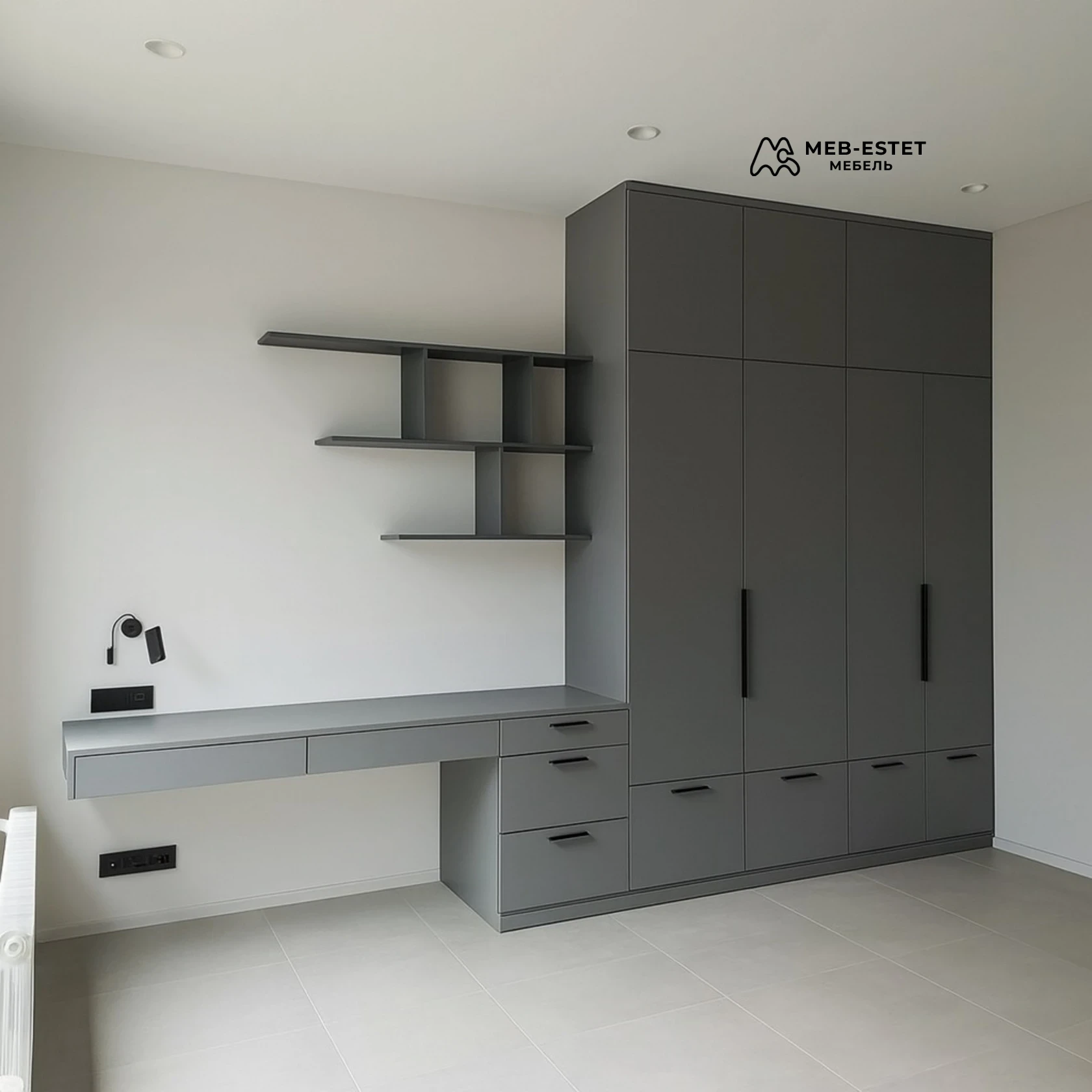 Современная встроенная композиция: высокие шкафы и выдвижная рабочая зона в единой цветовой гамме. Матовый серый фасад на МДФ с интегрированными ручками подчёркивает минимализм и премиум‑характер изделия.