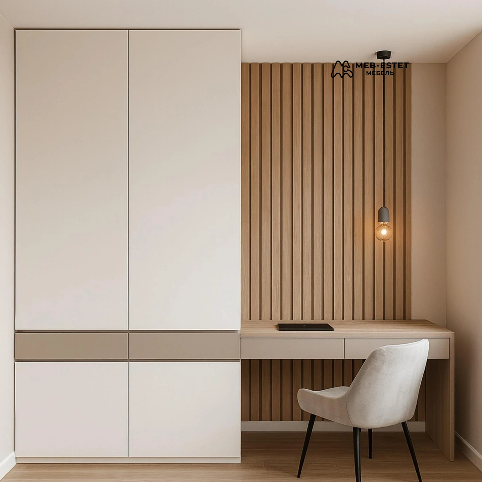 Современный встроенный шкаф с интегрированной рабочей зоной — решение для компактного и стильного интерьера. Чистые линии, матовые фасады кремового оттенка и деревянная вертикальная рейка создают тёплый скандинавский образ.
