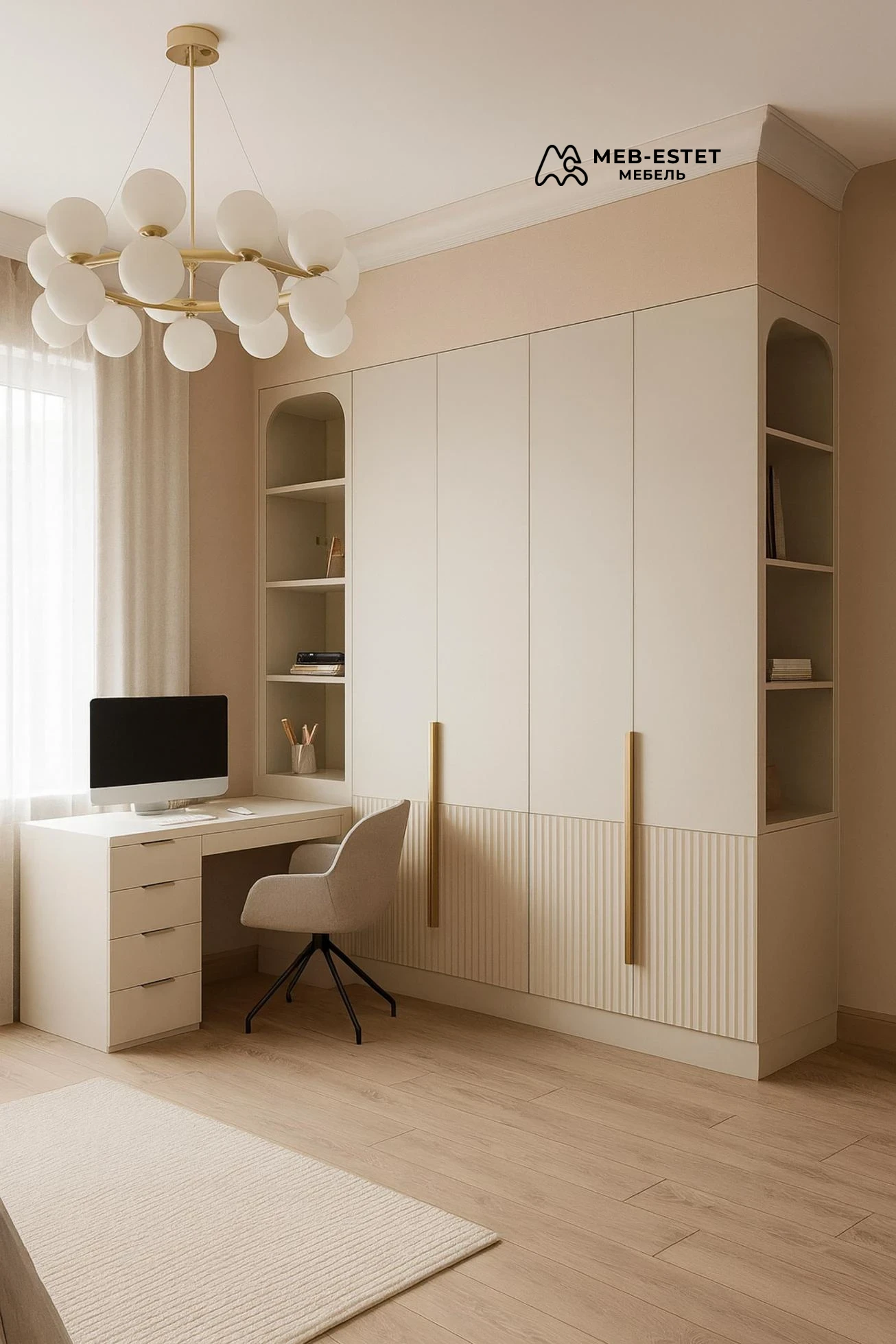 Элегантный встроенный шкаф с интегрированной рабочей зоной — решение для тех, кто ценит минимализм и премиальное исполнение. Фронт выполнен в матовой кремовой отделке с реечными фасадами в нижней части и металлическими удлинёнными ручками.