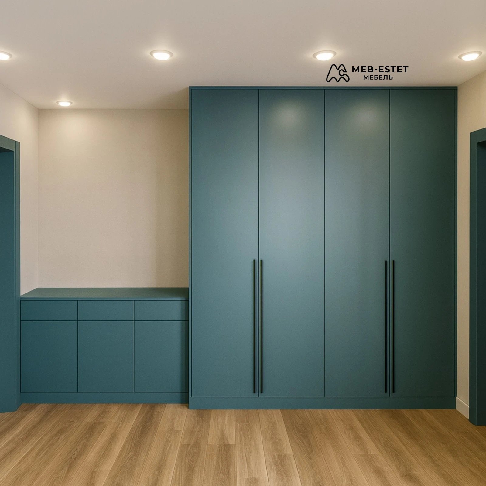 Комплект для прихожей: высокий встроенный шкаф с четырьмя распашными дверцами и низкая тумба с ящиками. Исполнение на основе крашеного МДФ в матовом покрытии, четкие скрытые стики, длинные металлические ручки и аккуратные угловые плинтуса.