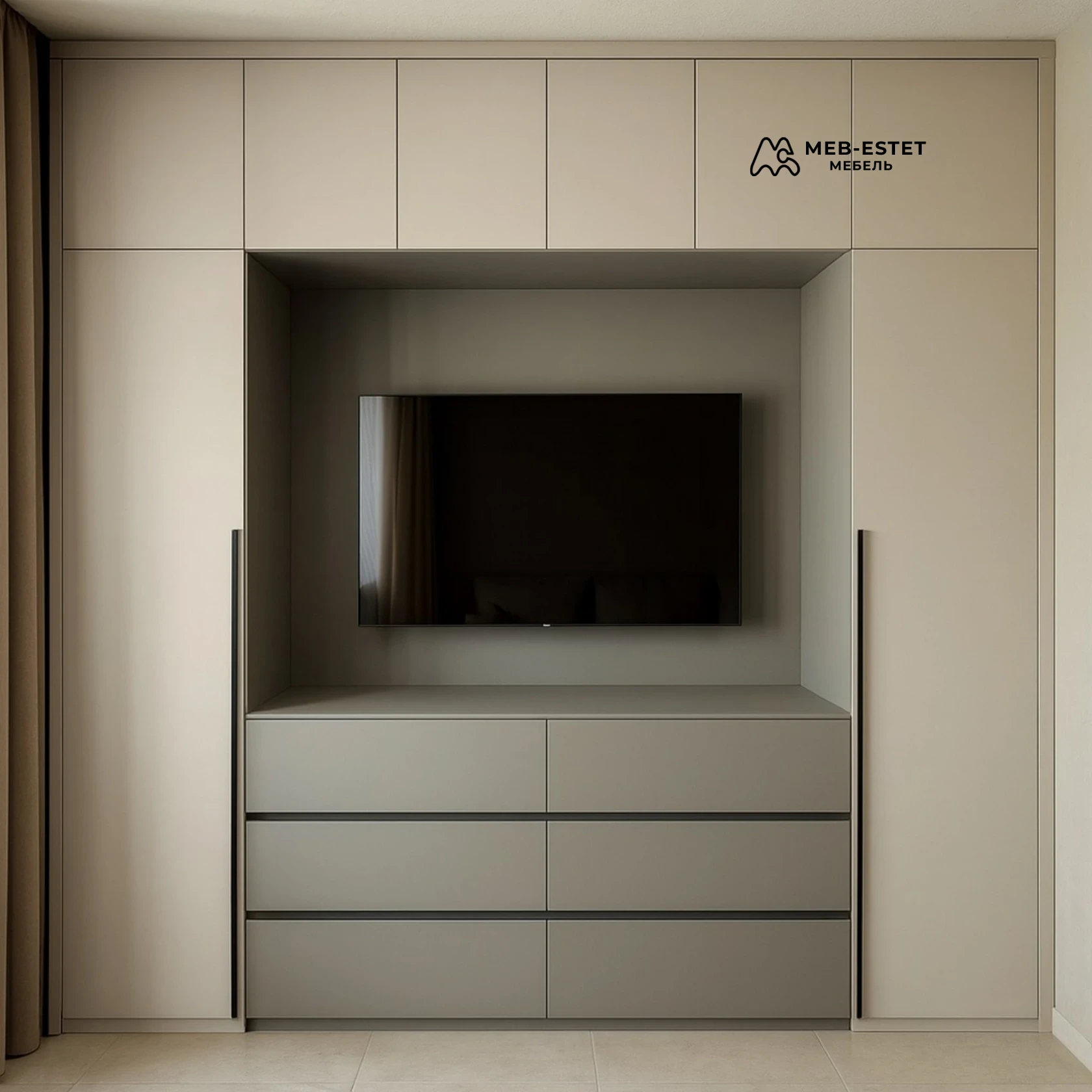 Премиальная встроенная мебель с аккуратной нишей для телевизора и вместительными выдвижными ящиками. Чистые геометрические линии и матовая поверхность создают спокойный современный интерьер.