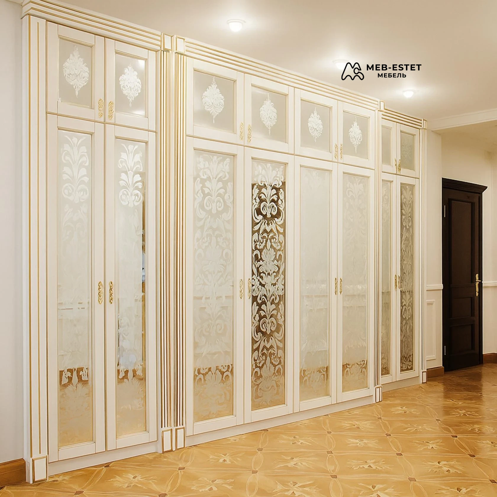 Элегантный встроенный шкаф в неоклассическом стиле с матовыми витражными стеклами и тонкой позолоченной раскладкой. Изделие выполнено по индивидуальным размерам, корпус и фасады — МДФ с декоративной фрезеровкой, стеклянные вставки обработаны пескоструйной техникой.