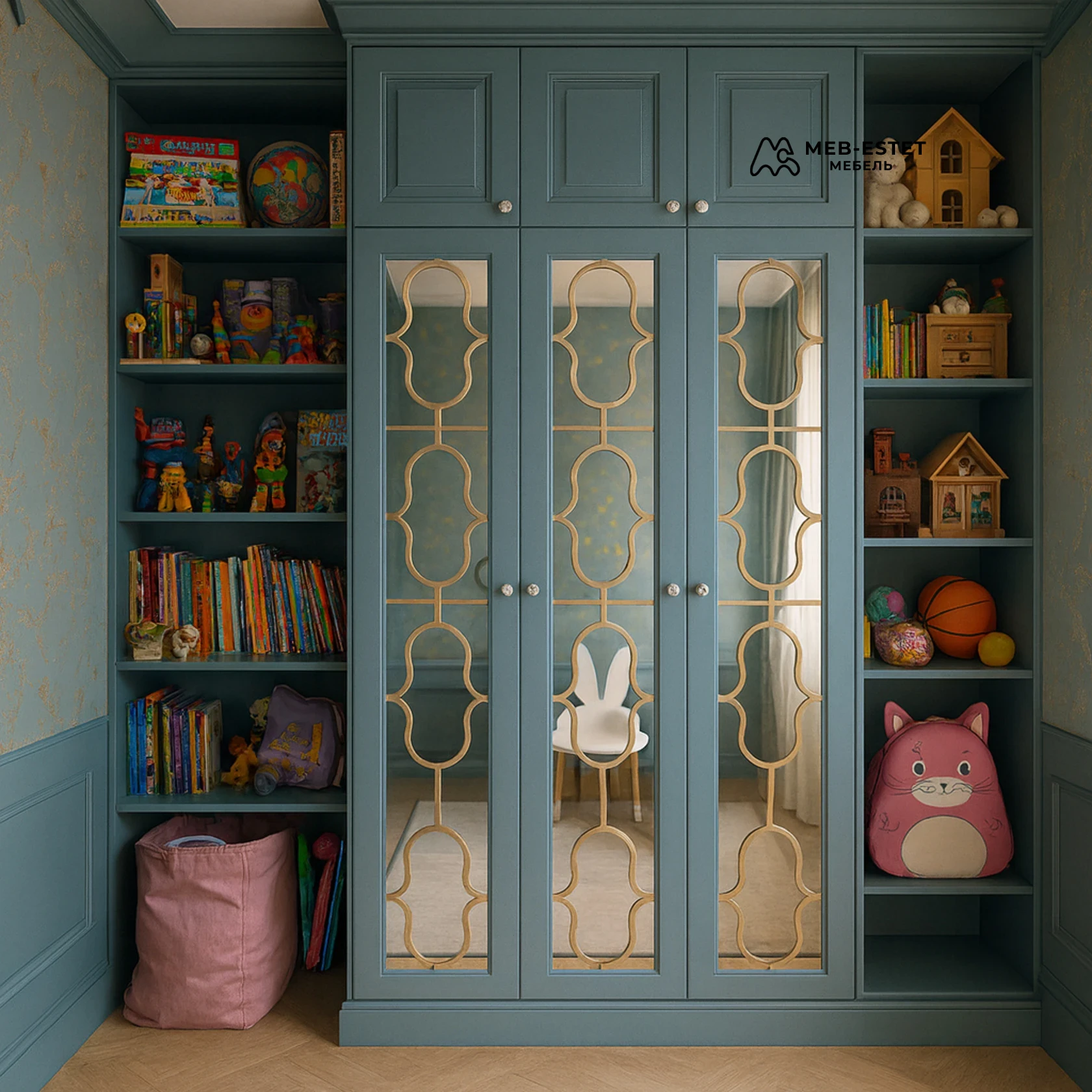 Элегантный встроенный шкаф с четырьмя распашными дверями и зеркальными вставками с декоративной решёткой. Изготовлен по индивидуальным размерам, идеально вписывается в нишу или детскую комнату.