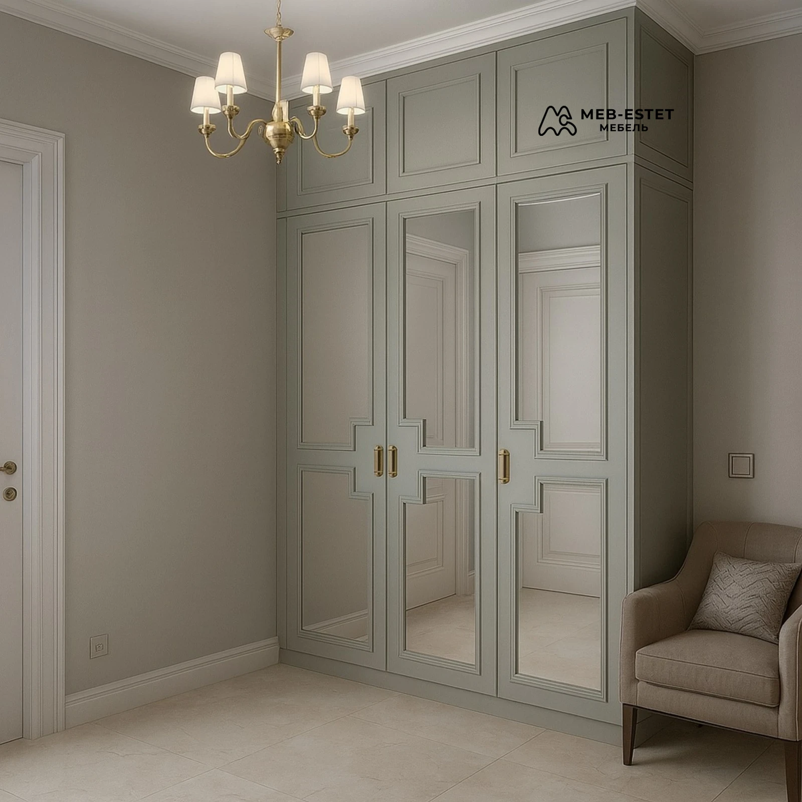 Классический встроенный шкаф с зеркальными вставками и филёнчатыми фасадами. Корпус и фасады выполнены из МДФ с эмалевой покраской, украшены фрезеровкой и пилястрами, ручки из латуни. Верхняя антресоль увеличивает полезный объём, внутри предусмотрены штанга, регулируемые полки и ниша для обуви.