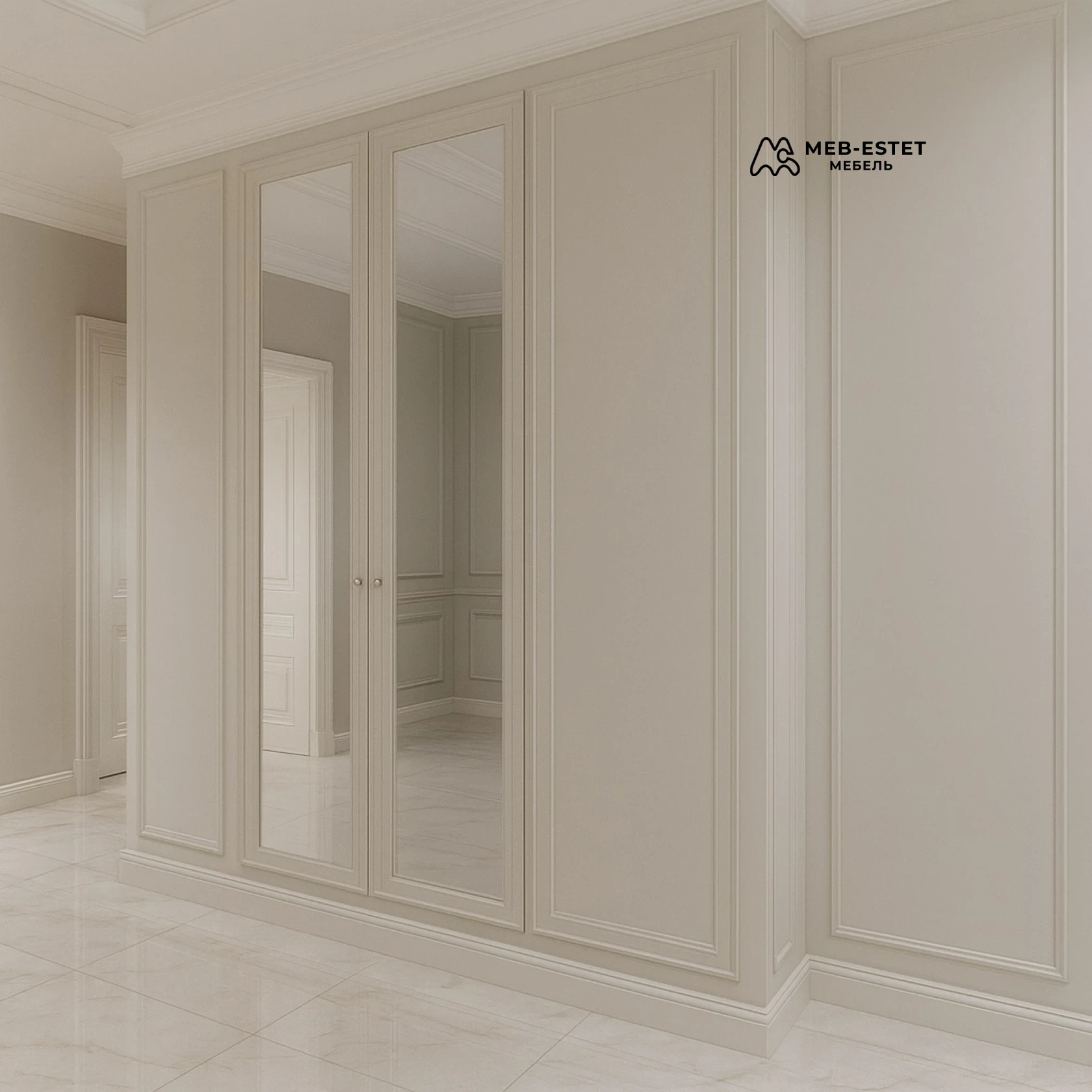 Элегантный встроенный шкаф в неоклассическом стиле с двумя зеркальными распашными дверями. Корпус и фасады — окрашенный МДФ с фрезеровкой и филёнками, декоративные пилястры и карниз подчёркивают стиль. Зеркала визуально расширяют прихожую, а выполнение до потолка даёт максимум хранения.