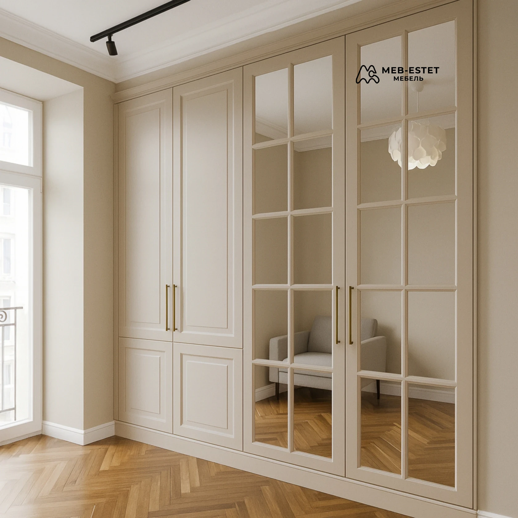 Элегантный встроенный шкаф в неоклассическом стиле: комбинированные распашные фасады с филёнками и зеркальными створками в раскладке. Идеально для спальни или прихожей, выполнен на заказ по высоте потолка.