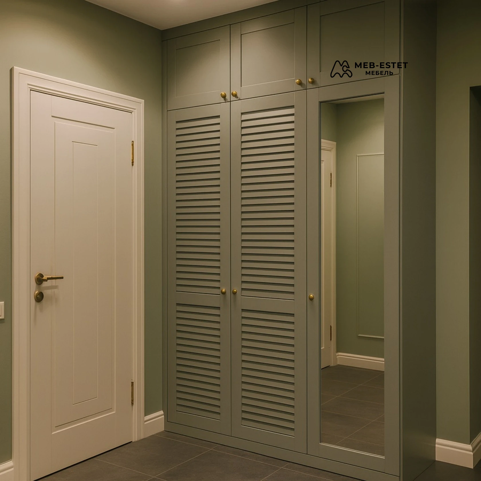 Элегантный встроенный шкаф для прихожей в классическом стиле с жалюзийными фасадами и зеркальной дверью. Выполнен под покраску в спокойный зелёный оттенок, оснащён верхними антресольными секциями — практичное решение для компактного холла.
