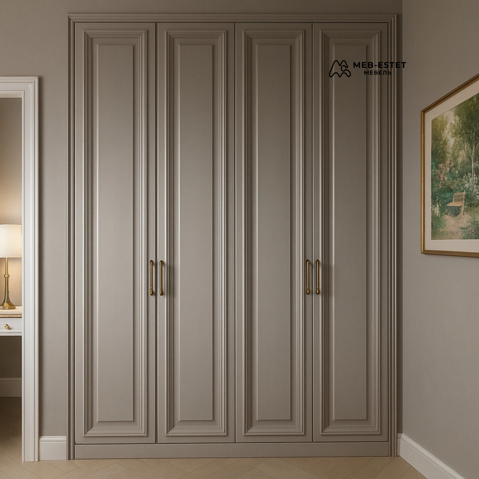 Встроенный распашной шкаф в неоклассическом стиле, выполненный в сдержанной бежево-серой гамме. Фасады — фрезерованная МДФ с матовой эмалевой отделкой, аккуратные латунные ручки. Конструкция рассчитана на интенсивную эксплуатацию и обеспечивает премиальный внешний вид.