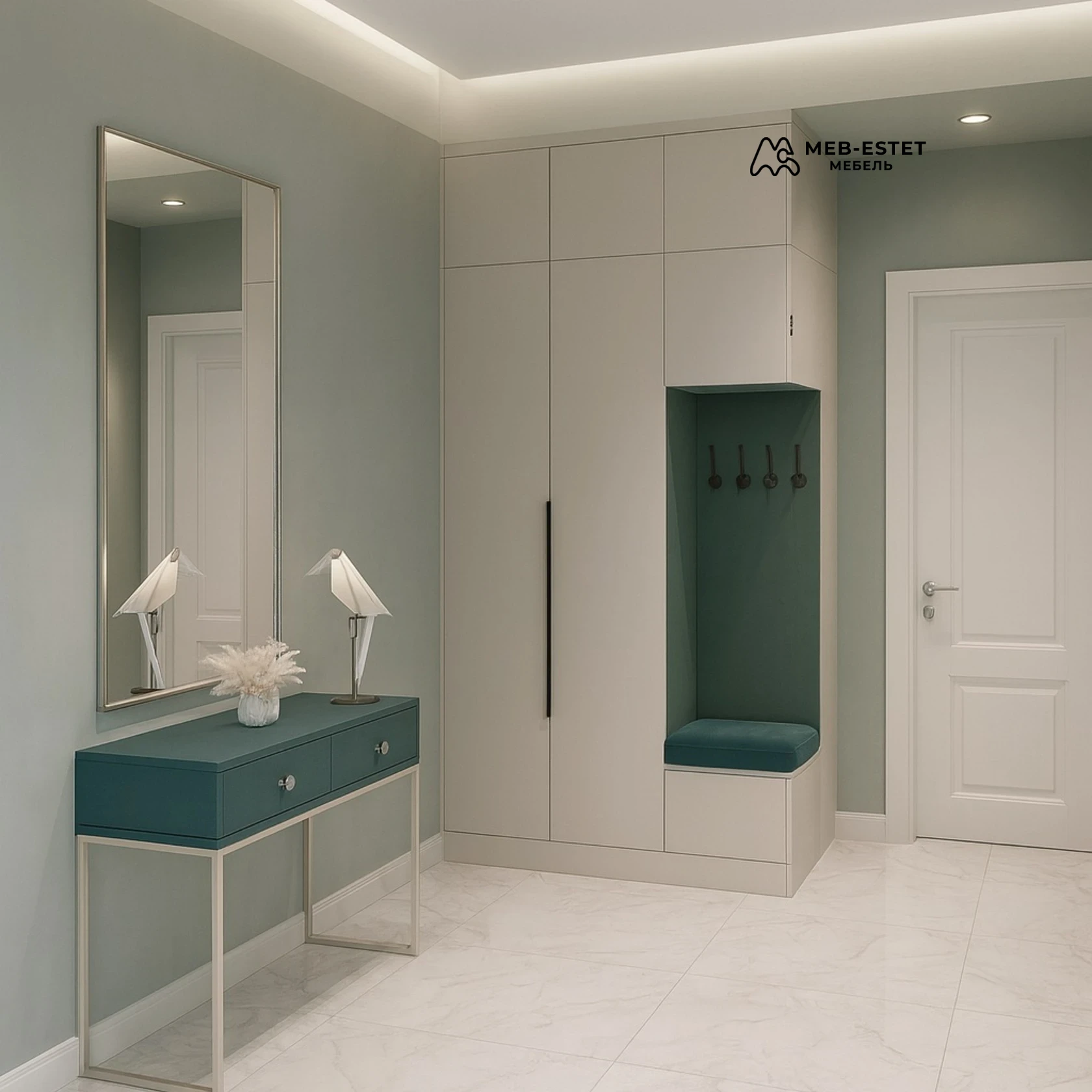 Встроенный шкаф для прихожей, выполнен под индивидуальный заказ с акцентом на премиальное исполнение. Матовые МДФ-фасады нейтрального серого цвета сочетаются с глубокой зелёной нишей и мягкой сидушкой. Конструкция сочетает платяную секцию, антресоли и открытую зону для быстрой посадки/снятия обуви.