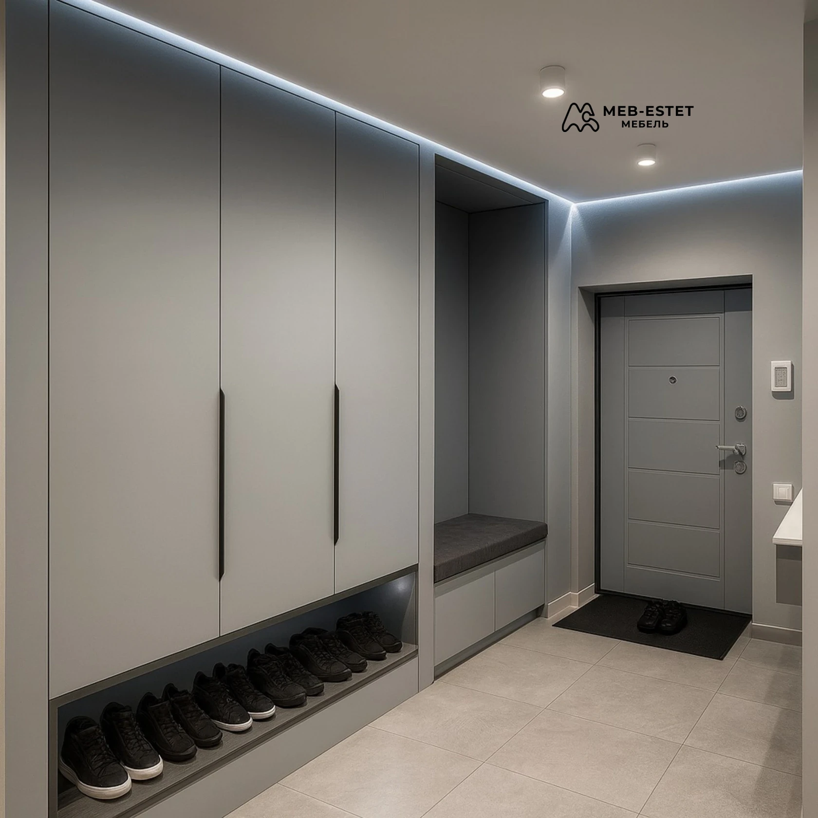 Компактная встроенная прихожая на заказ: аккуратные распашные фасады из МДФ в матовом сером оттенке, интегрированная ниша для обуви и мягкая лавка. Решение продумано для ежедневного комфорта — закрытые шкафы для верхней одежды, выдвижные ящики и подсветка в зоне ног. Изделие изготавливается по размерам помещения с выбором фурнитуры и доводчиков.