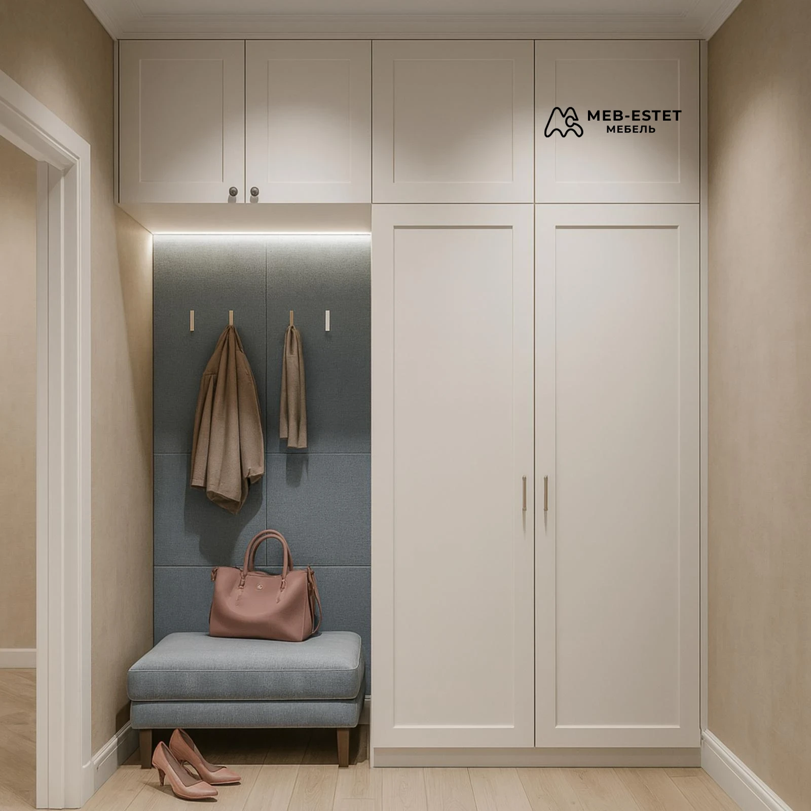 Элегантный встроенный шкаф для прихожей, выполненный под заказ в неоклассическом стиле. Распашные МДФ-фасады с фрезеровкой, верхние антресоли и мягкая стеновая панель с LED-подсветкой создают аккуратную и функциональную зону при входе.