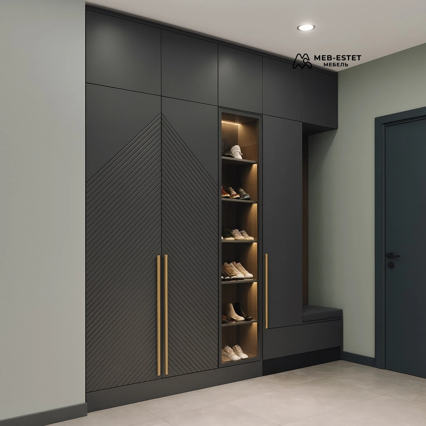 Встроенная прихожая высокого класса: матовые фрезерованные фасады МДФ с диагональной фрезеровкой, тонкие золотые ручки и подсветка в нише для обуви. Внутреннее наполнение — полки для обуви, отделение для одежды со штангой, антресоли и посадочное место с мягким сиденьем.