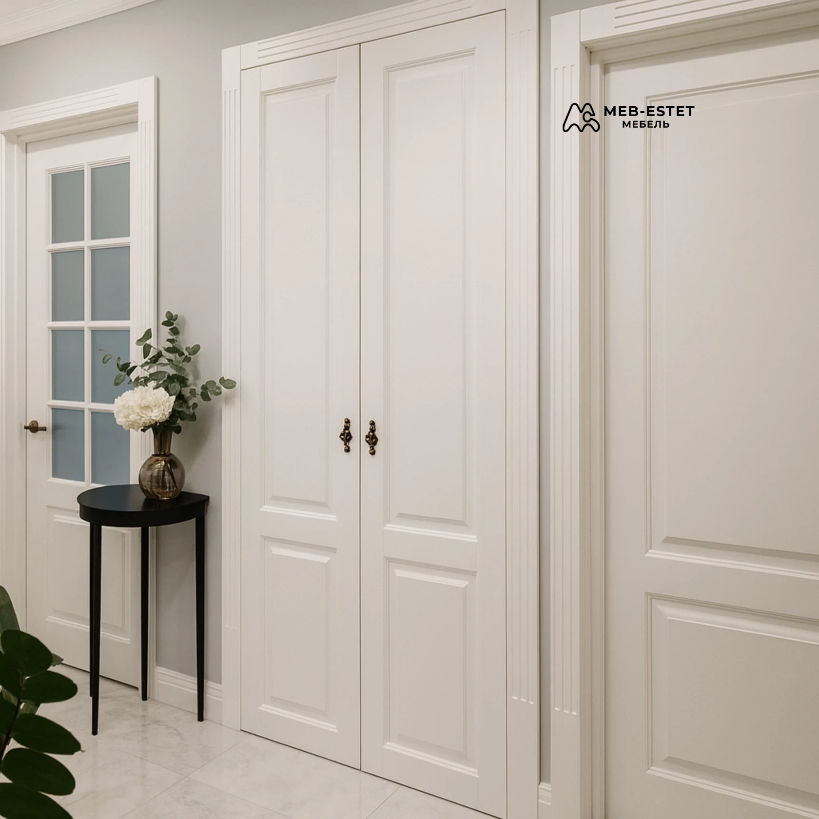 Элегантный встроенный шкаф в прихожую в неоклассическом стиле. Двери с классической филёнкой и декоративными пилястрами, окрашен в матовую эмаль — выглядит как часть архитектуры интерьера.