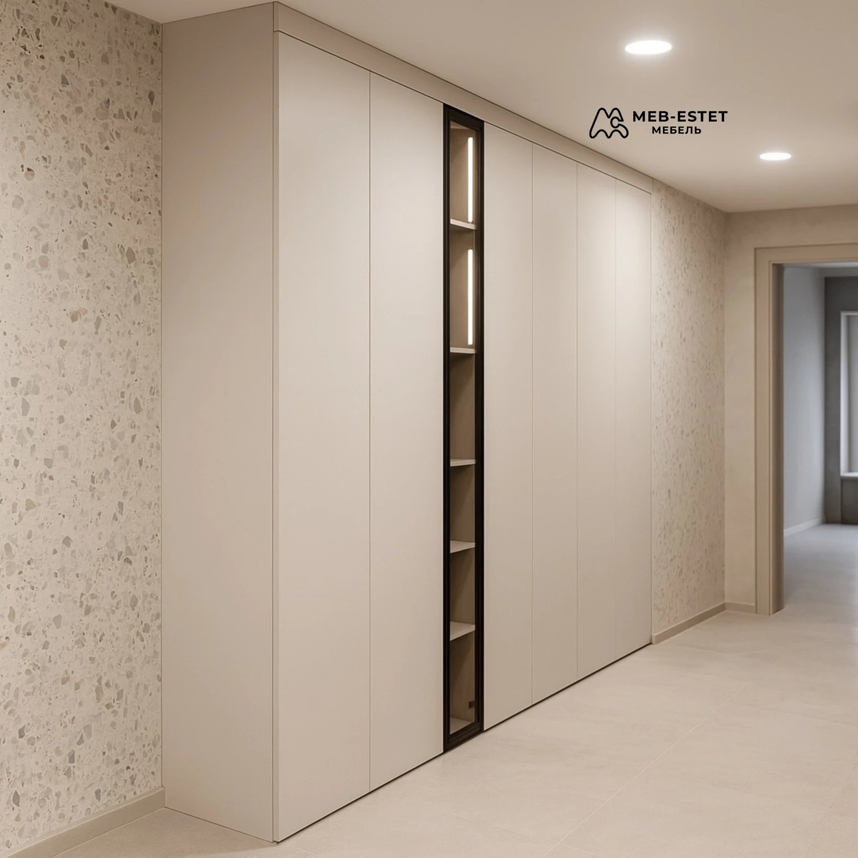 Современный встроенный шкаф в прихожую — премиальная сборка под потолок с лаконичными матовыми фасадами. Вертикальная ниша со стеклом и интегрированной LED-подсветкой выделяет композицию и удобно использует пространство.
