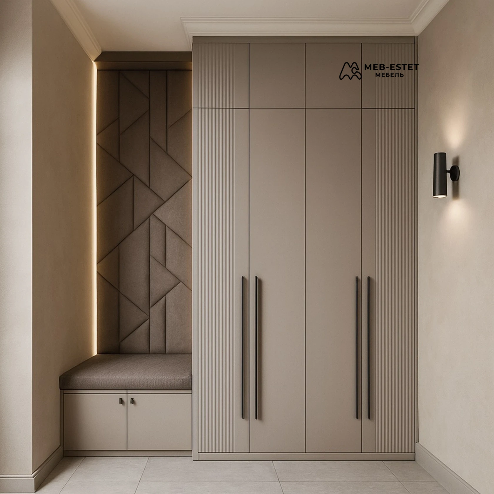 Элегантный встроенный шкаф с мягкой банкеткой — решение для современной прихожей. Корпус и фасады из крашеного МДФ с матовой поверхностью и вертикальной реечной фактурой. Встроенная подсветка за мягким панно создаёт уют, а вместительная нижняя тумба служит для обуви и мелочей.