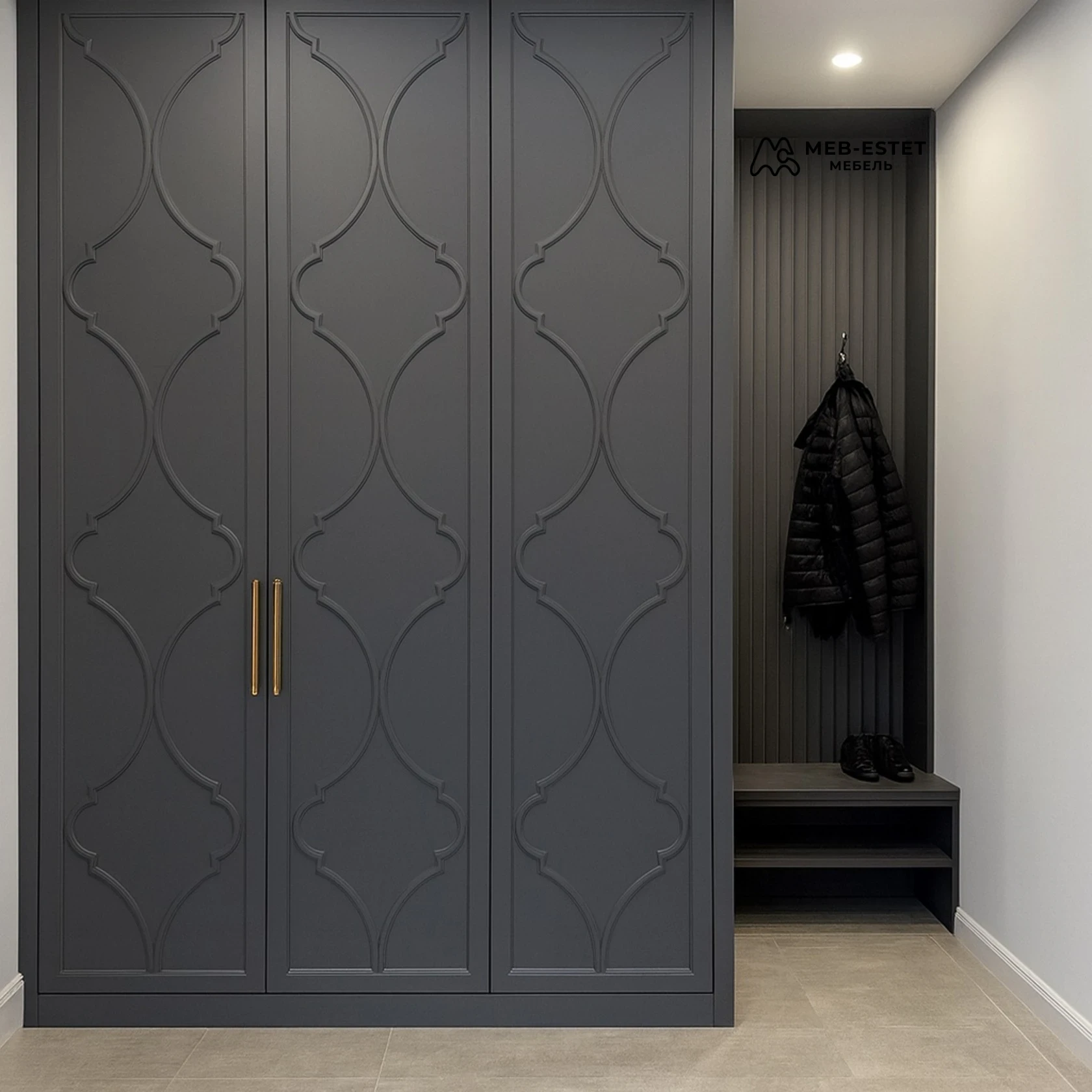 Трёхдверный встроенный шкаф в прихожую в графитовом матовом оттенке — сочетание неоклассики и современного минимализма. Фасады из МДФ с фрезеровкой, окрашенные эмалью, декорированы латунными ручками. Конструкция рассчитана на интенсивную эксплуатацию: скрытые петли с доводчиками, роликовые направляющие для ящиков, регулируемые полки и штанга для вешалок.