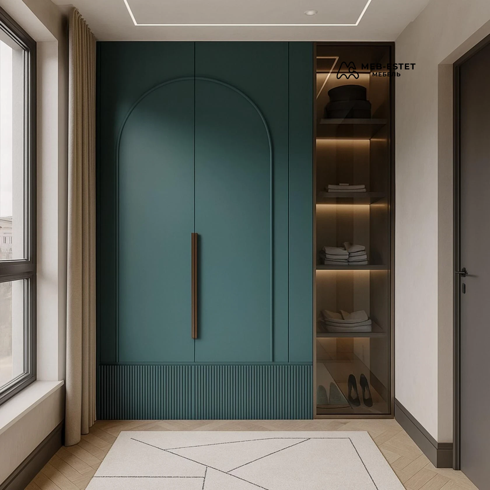 Элегантный встроенный шкаф по индивидуальным размерам: глубокий матовый фасад из МДФ с арочным рельефом и низкой реечной панелью. Правая часть выполнена как витрина со стеклянными дверцами и встроенной тёплой подсветкой, удобна для хранения обуви и аккуратной демонстрации полотенец или аксессуаров.