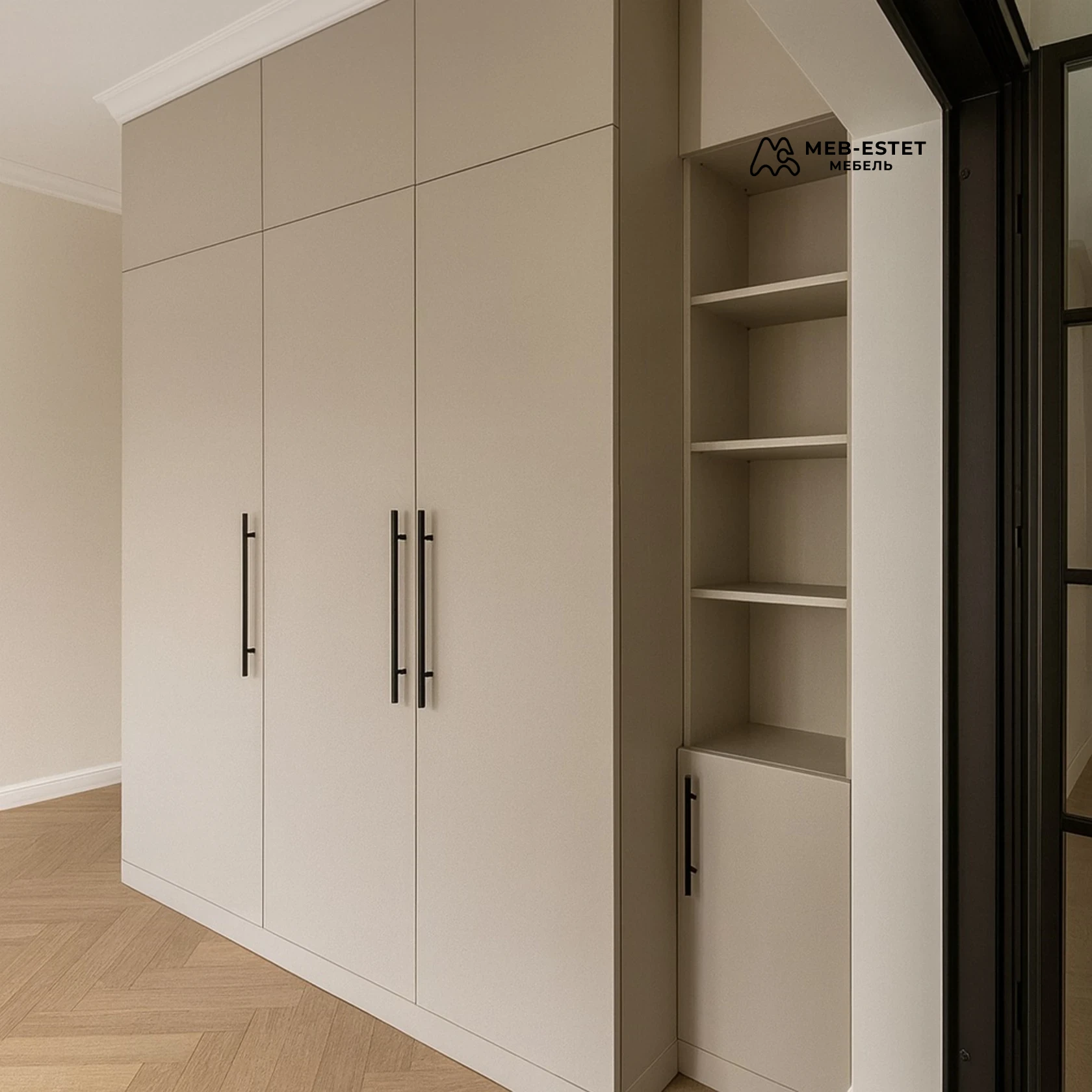 Классический встроенный шкаф по индивидуальным замерам: лаконичные фасады в кремовом матовом оттенке, высокий короб до потолка и встроенный секционный пенал с открытыми полками. Конструкция выполнена из МДФ с эмалевым покрытием, скрытые петли и длинные металлические ручки обеспечивают надежность и аккуратный вид.