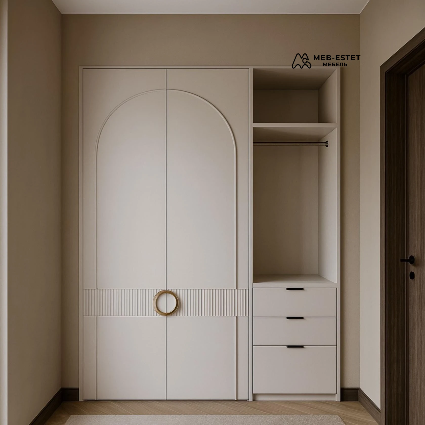 Элегантный встроенный шкаф премиум-класса, выполнен в спокойной кремовой палитре. Две распашные двери с фрезерованным арочным декором и рельефной рейкой по центру сочетаются с открытой секцией для быстрого доступа — ниша с штангой и тремя выдвижными ящиками.