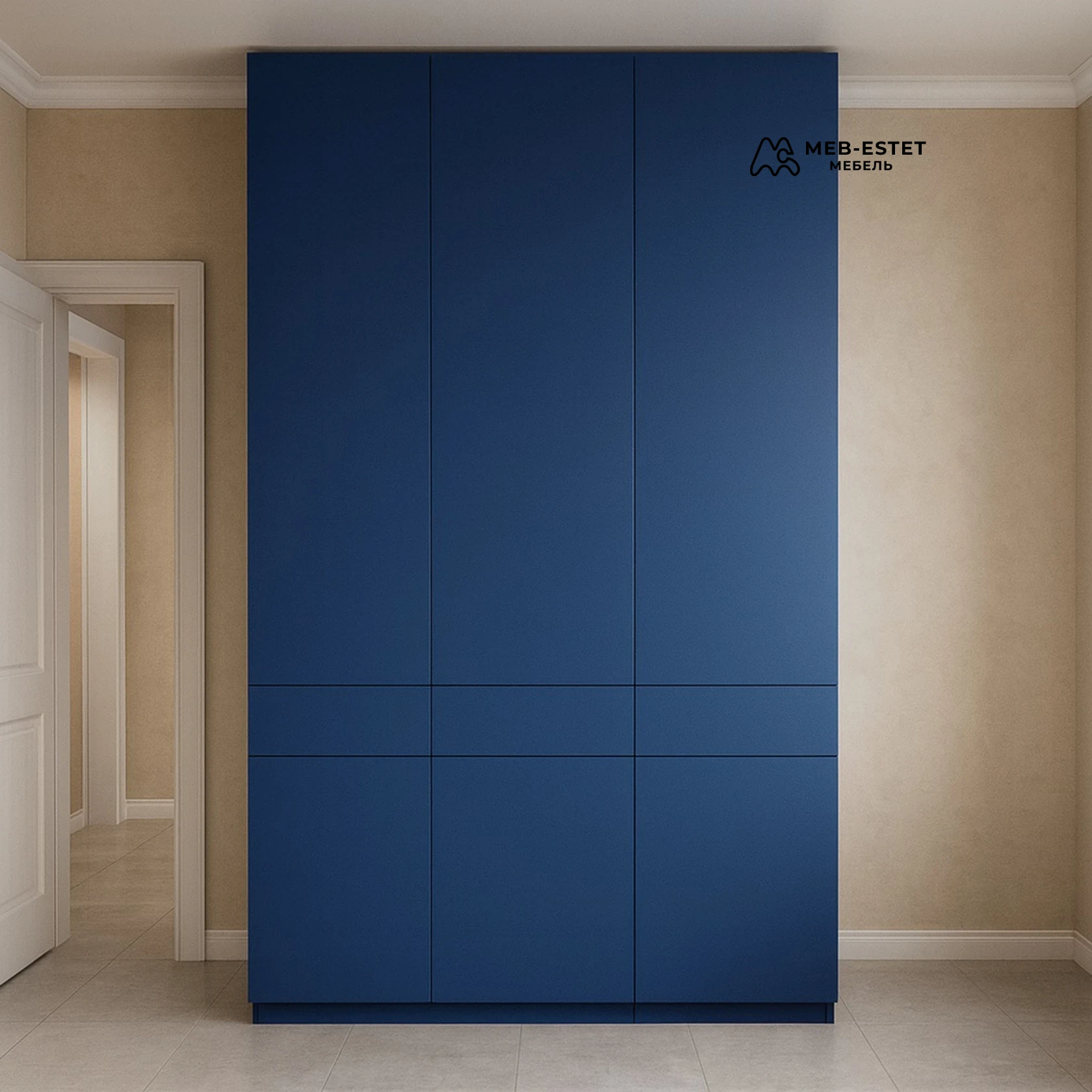 Высокий встроенный шкаф в премиальном исполнении: матовые синие фасады на МДФ с эмалевой отделкой, бесшовные кромки и минималистичные скрытые ручки. Корпус — ЛДСП высокой плотности, петли с доводчиками и направляющие с плавным закрыванием обеспечивают долговечность и комфорт.