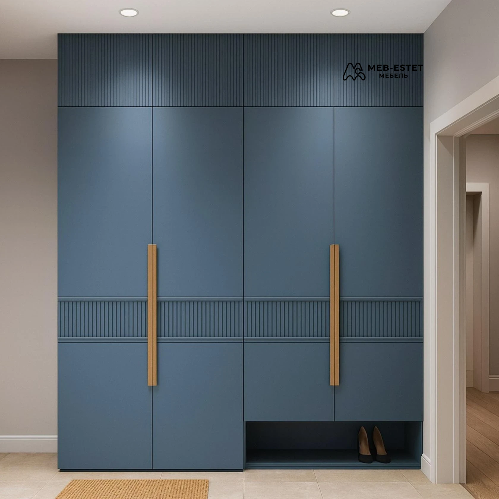 Полноценный встроенный шкаф для прихожей в современном минималистичном стиле. Фасады из матового МДФ с реечными вставками по верхней и средней линии создают глубину и тактильную текстуру. Длинные деревянные вертикальные ручки подчёркивают высоту и добавляют контраста.