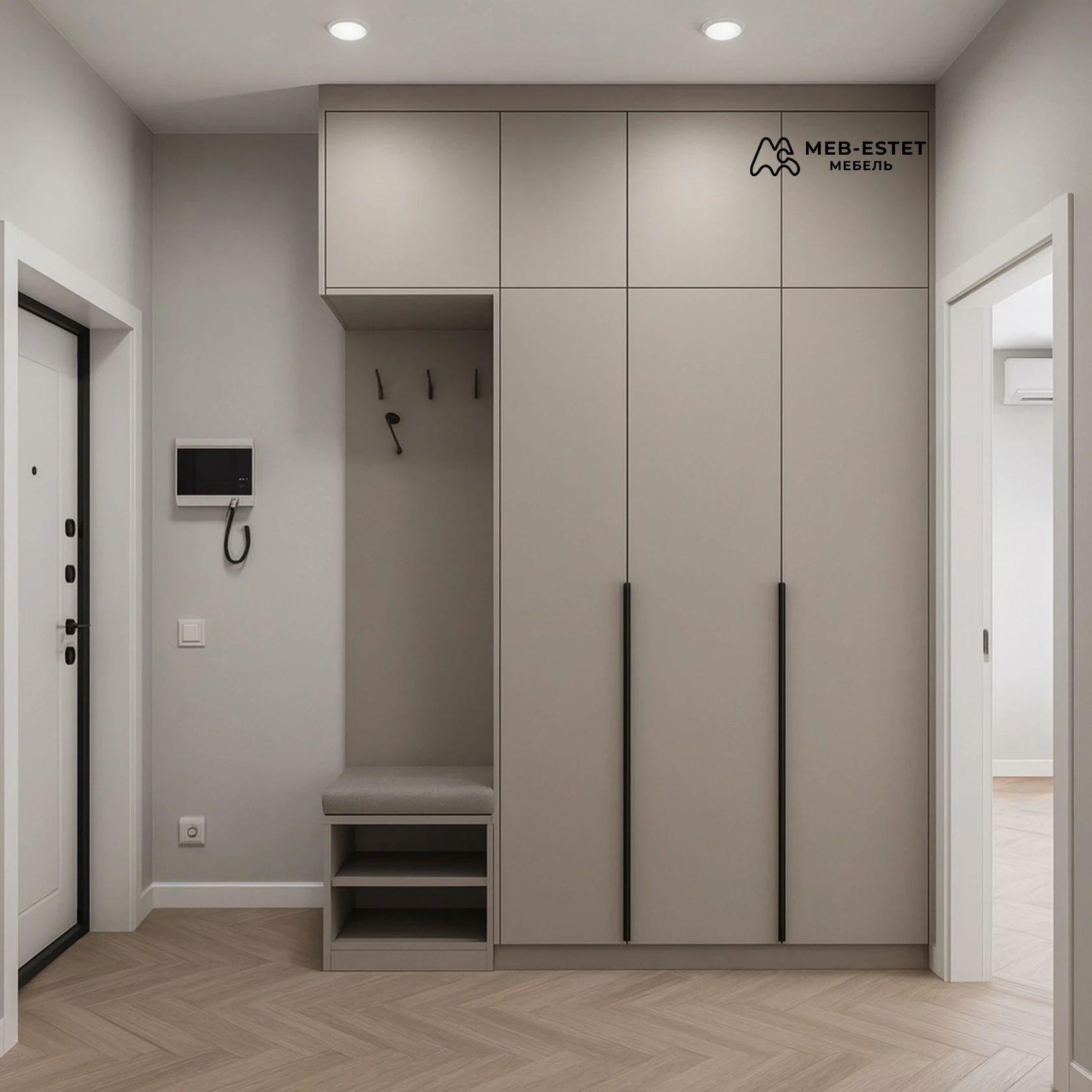 Универсальное решение для компактных и просторных входных зон, легко адаптируется под планировку и отделку.