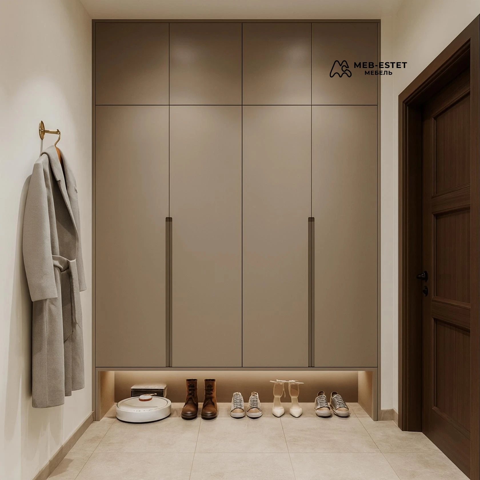 Встроенный прихожий шкаф премиум‑класса — минималистичная модульная система для аккуратного хранения верхней одежды и обуви. Чистые фасады, интегрированные вертикальные ручки и скрытая ниша внизу с подсветкой создают аккуратный и практичный входной гарнитур.